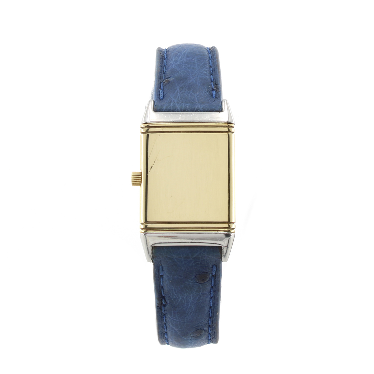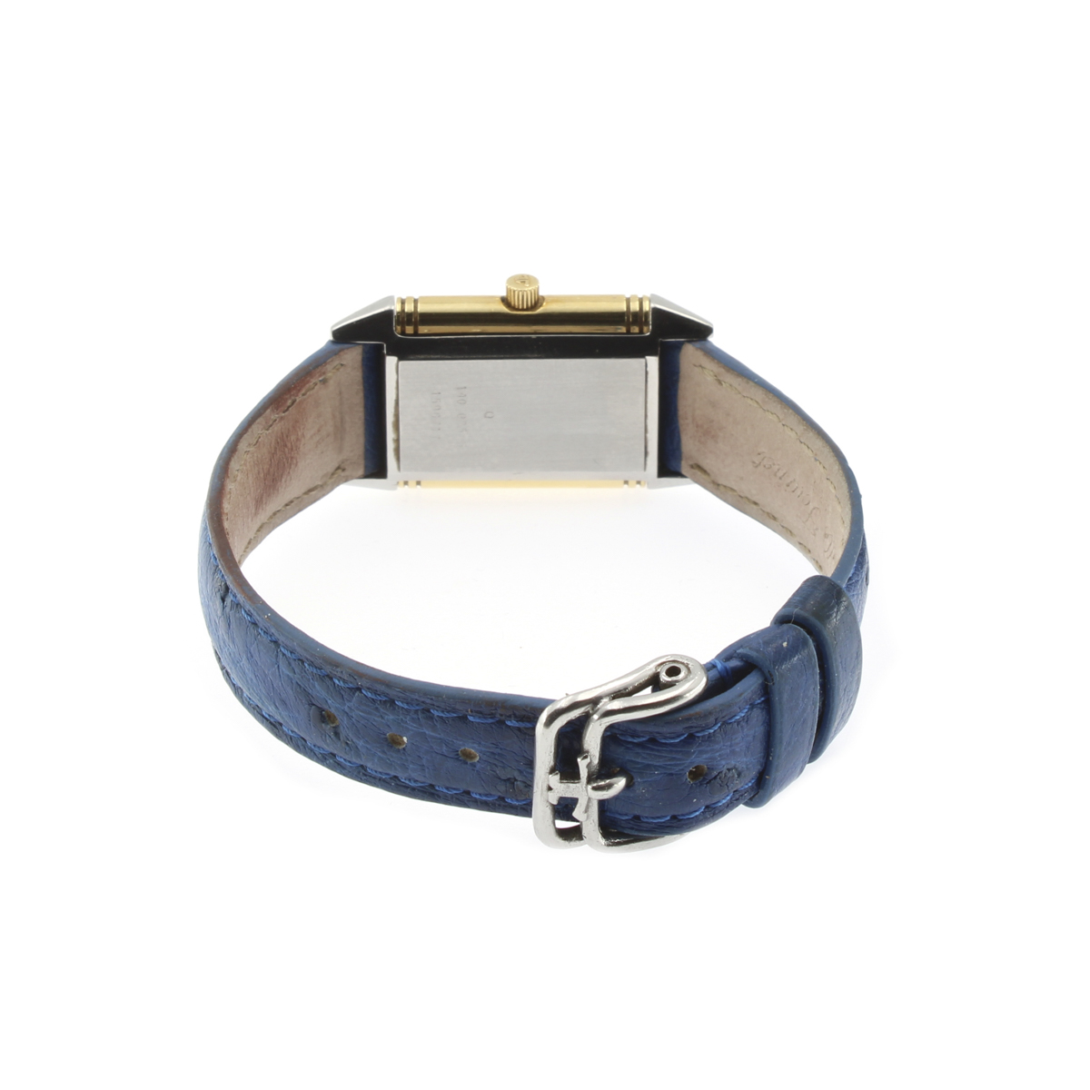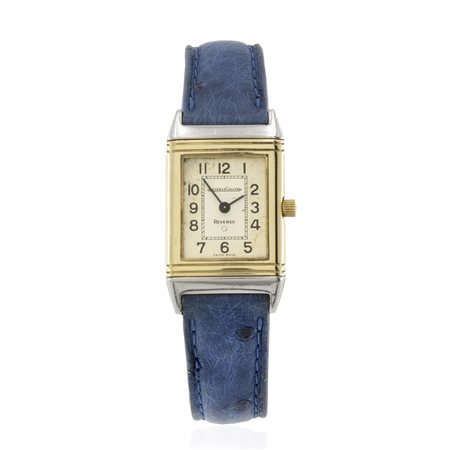 Jager Le Coultre Reverso orologio da donna vintage anni 80 circa in oro giallo 18kt e acciaio, ref. 1400255 - 1596717, cassa 33x19 mm. quadrante duodial con numeri arabi, segni di usura, vetro zaffiro, movimento al quarzo, cinturino in pelle con fibbia in metallo, cassa, quadrante e movimento firmati