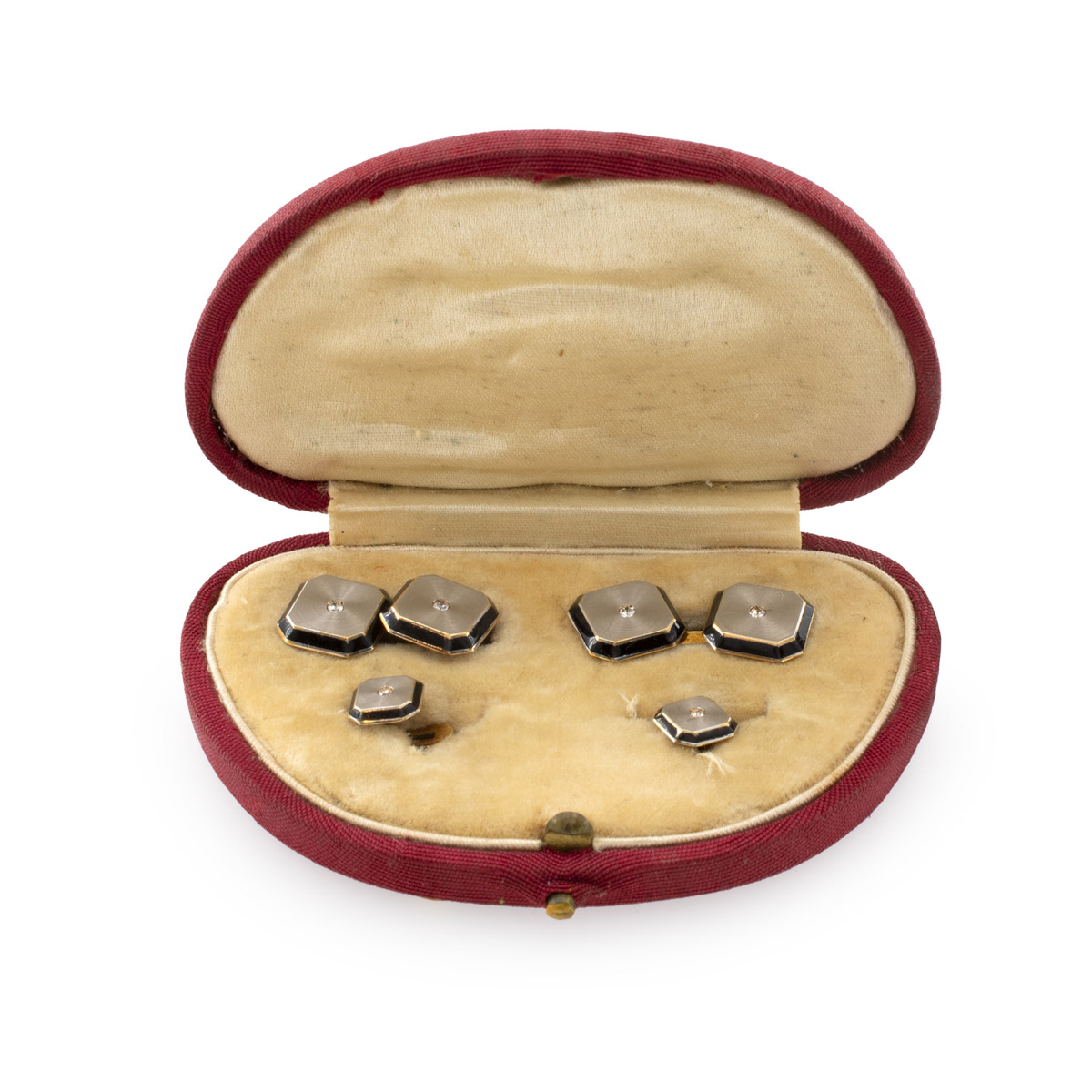 Set gemelli e bottoni da sparato primi 900 peso 9 gr. in oro bianco e giallo 18kt smalto nero, centrati da diamanti taglio brillante antico, completi di scatola