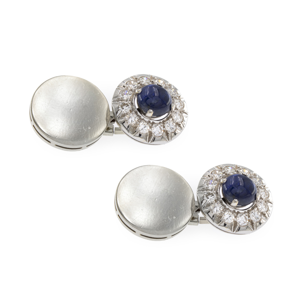 Gemelli in oro bianco 18kt zaffiri e diamanti peso 14 gr. zaffiri taglio cabochon e diamanti taglio brillante ct 1 circa, diametro 1,4 cm.