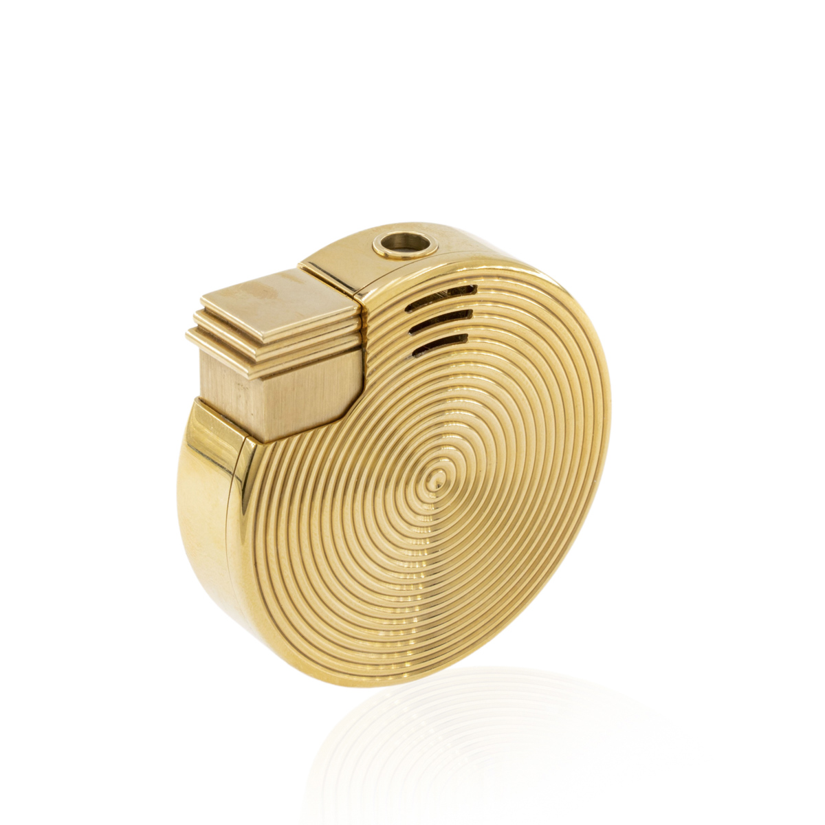 Bulgari accendino vintage firmato peso 96 gr. in oro giallo 18kt di forma circolare a motivo di raggiera, diametro 4,4 cm. completo di scatola e astuccio
