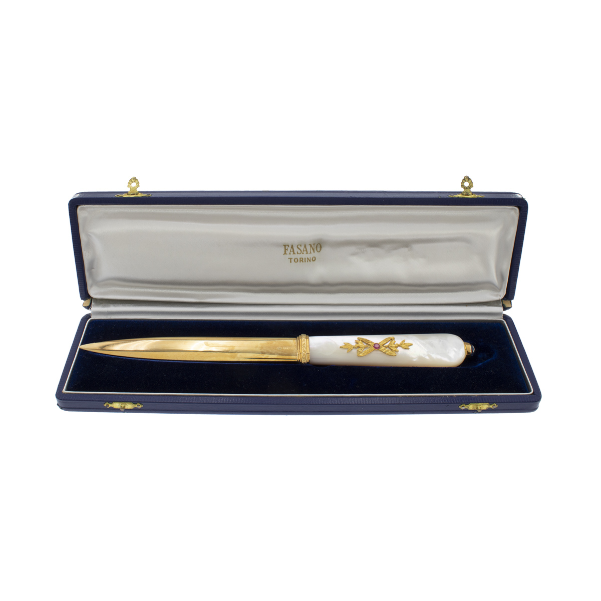 Tagliacarte in oro giallo 18kt Torino, firmato Fasano peso 101 gr. manico in madreperla e oro impreziosito da uno zaffiro taglio cabochon e due rubini tondi , lunghezza 20 cm. completo di scatola