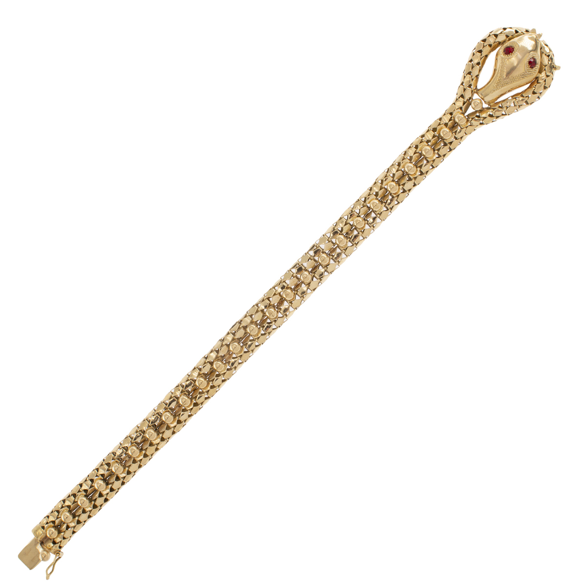 Bracciale a serpente in oro giallo 18kt anni 40/50 peso 30 gr. testa con due rubini tondi, chiusura a scomparsa, lunghezza 19,5 cm.