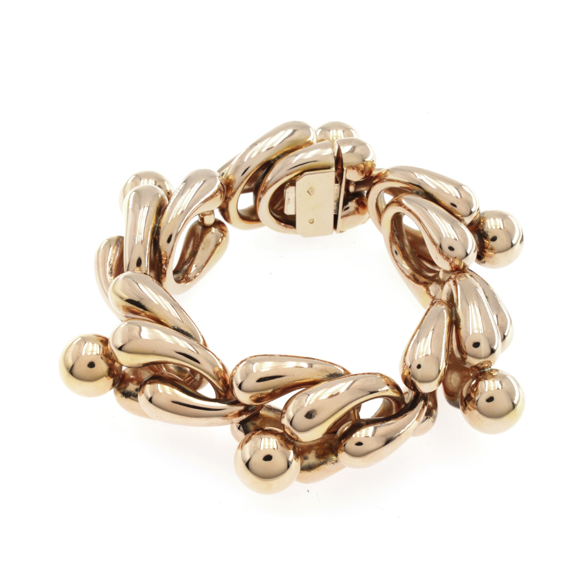Bracciale in oro rosa 18kt anni 40/50 peso 129 gr. maglie snodabili sormontate da sfere, chiusura a scomparsa, lunghezza 19 cm.