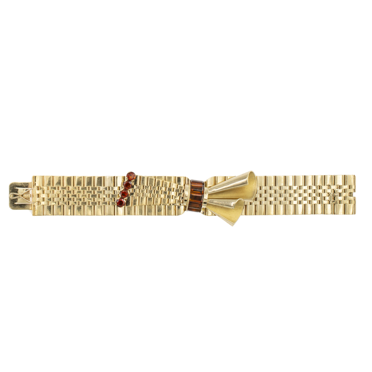 Bracciale maglia a carrarmato con fiocco centrale anni 40 peso 85 gr. in oro giallo 9kt e quarzi citrini, chiusura a scomparsa, lunghezza 17,5 cm.