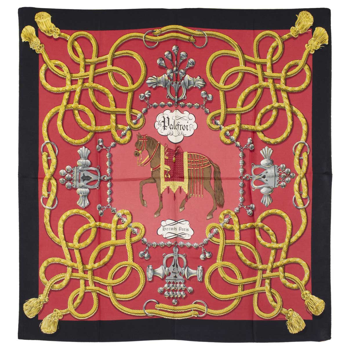 Hermes foulard vintage collezione Palefrois misure 90x90 cm. in seta nei toni del bordeaux, giallo oro e nero, completo di scatola