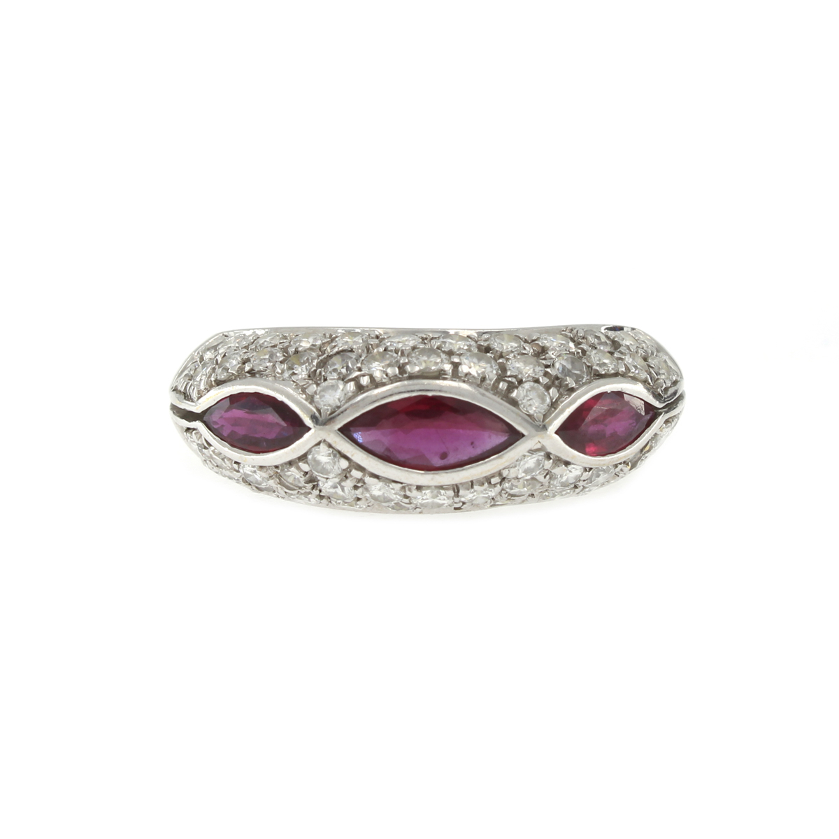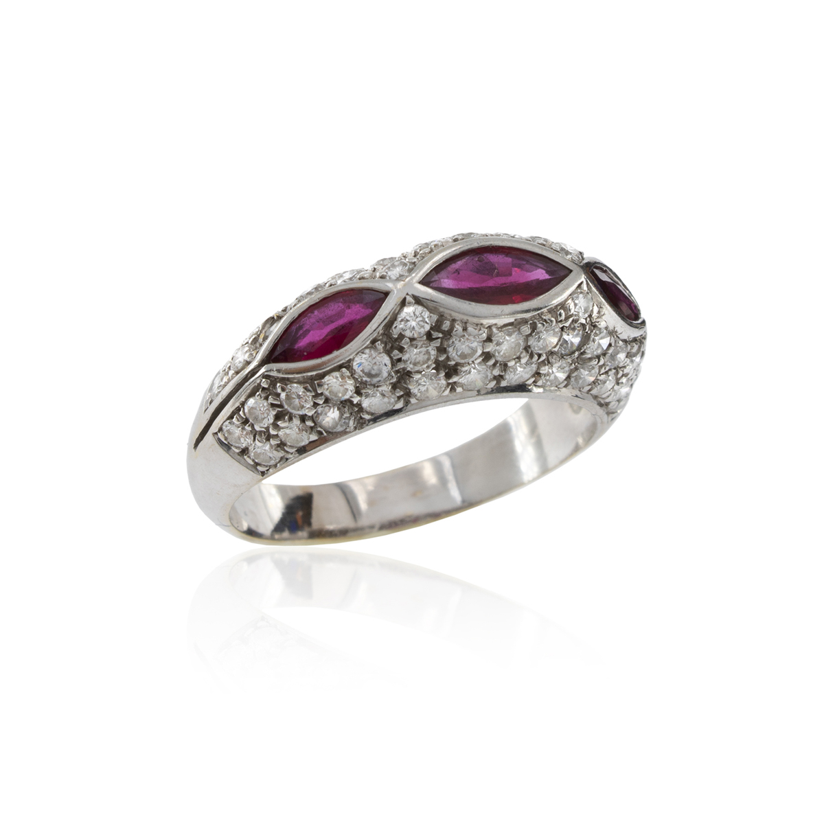 Anello in oro bianco 18kt rubini e diamanti peso 6 gr. tre rubini taglio marquise ct 0,90 circa e diamanti taglio brillante ct 1 circa, misura 17