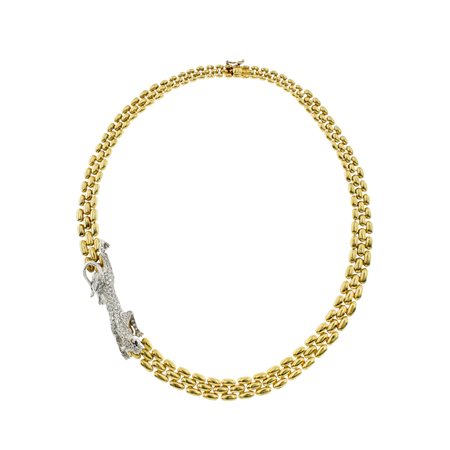 Collana maglia panthere in oro giallo 18kt peso 72 gr. sormontato da una pantera in oro bianco e diamanti taglio brillante ct 2,50 circa, occhi di zaffiri, chiusura a scomparsa, lunghezza 42 cm.