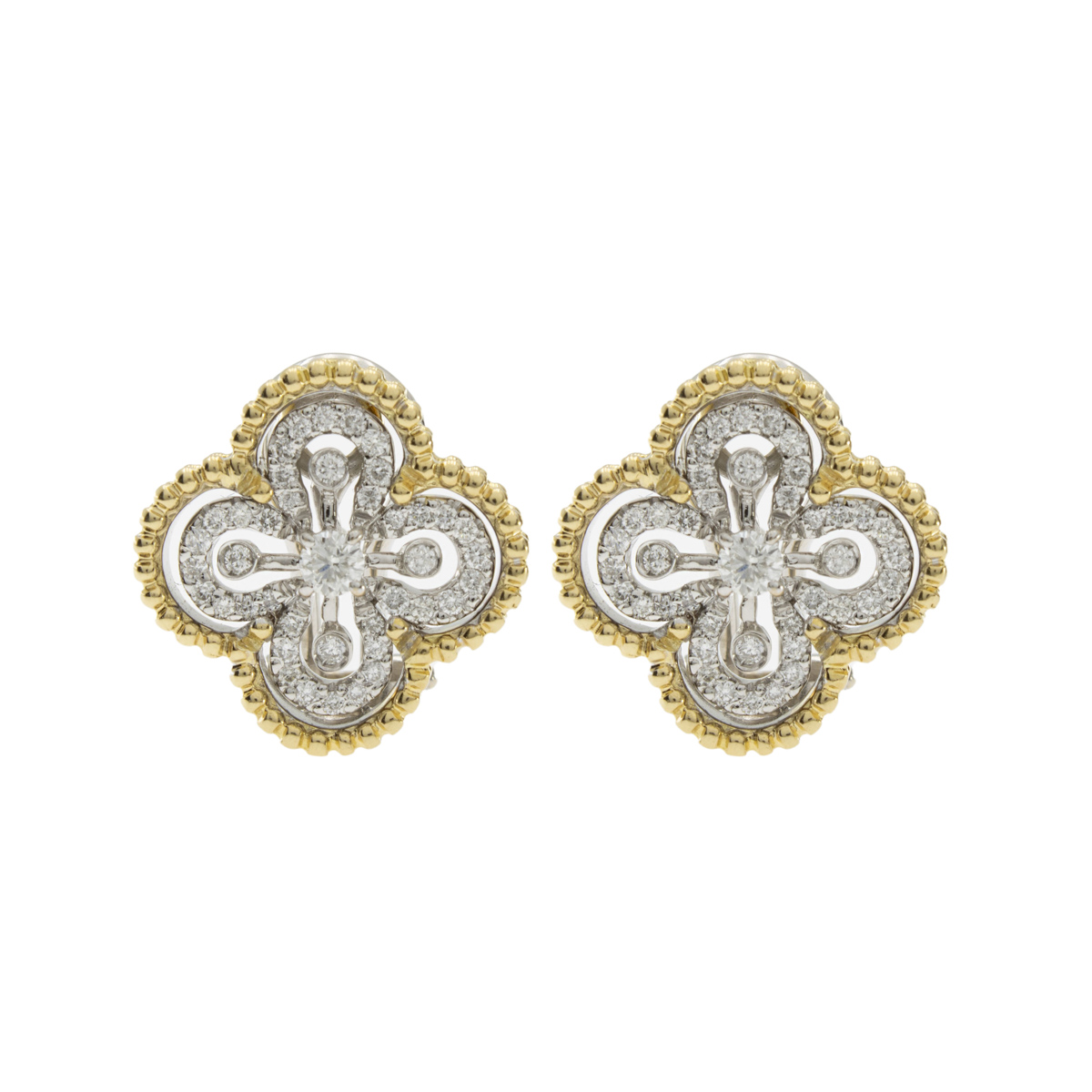 Orecchini a lobo in oro due colori 18kt peso 9 gr. diamanti taglio brillante ct 1 circa, diametro 1,7 cm.