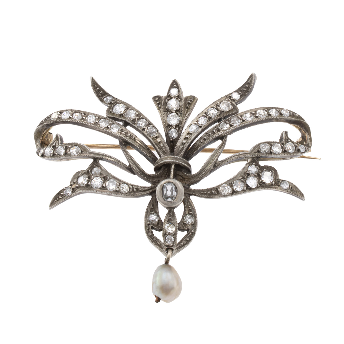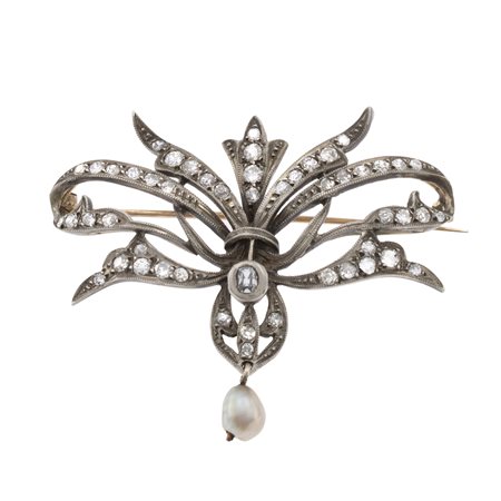 Antica spilla in oro argento con rose coroné e diamanti fine 800 peso 10 gr. taglio brillante antico, perlina pendente, dimensioni 4,5x5,5 cm.