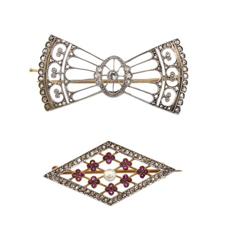 Due spille in oro argento anni 30/40 peso 10 gr. rispettivamente un fiocco con rose di diamante e un rombo con rose, rubini e perlina, misure diverse