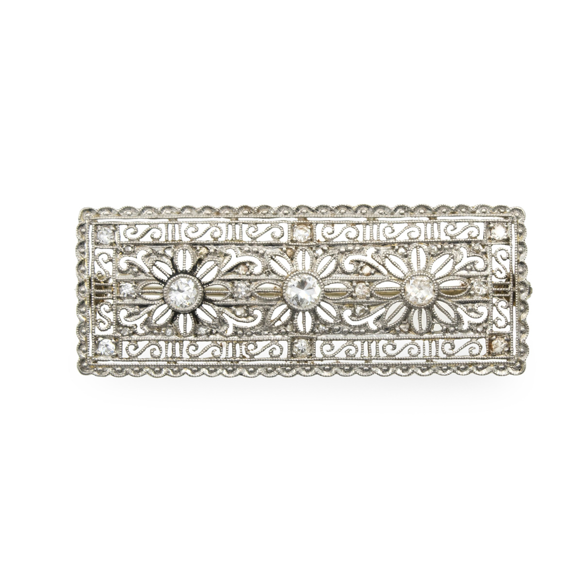 Spilla rettangolare in oro a due colori 18kt e diamanti anni 30/40 peso 6 gr. taglio brillante antico ct 0,25 circa, dimensioni 4x1,5 cm.