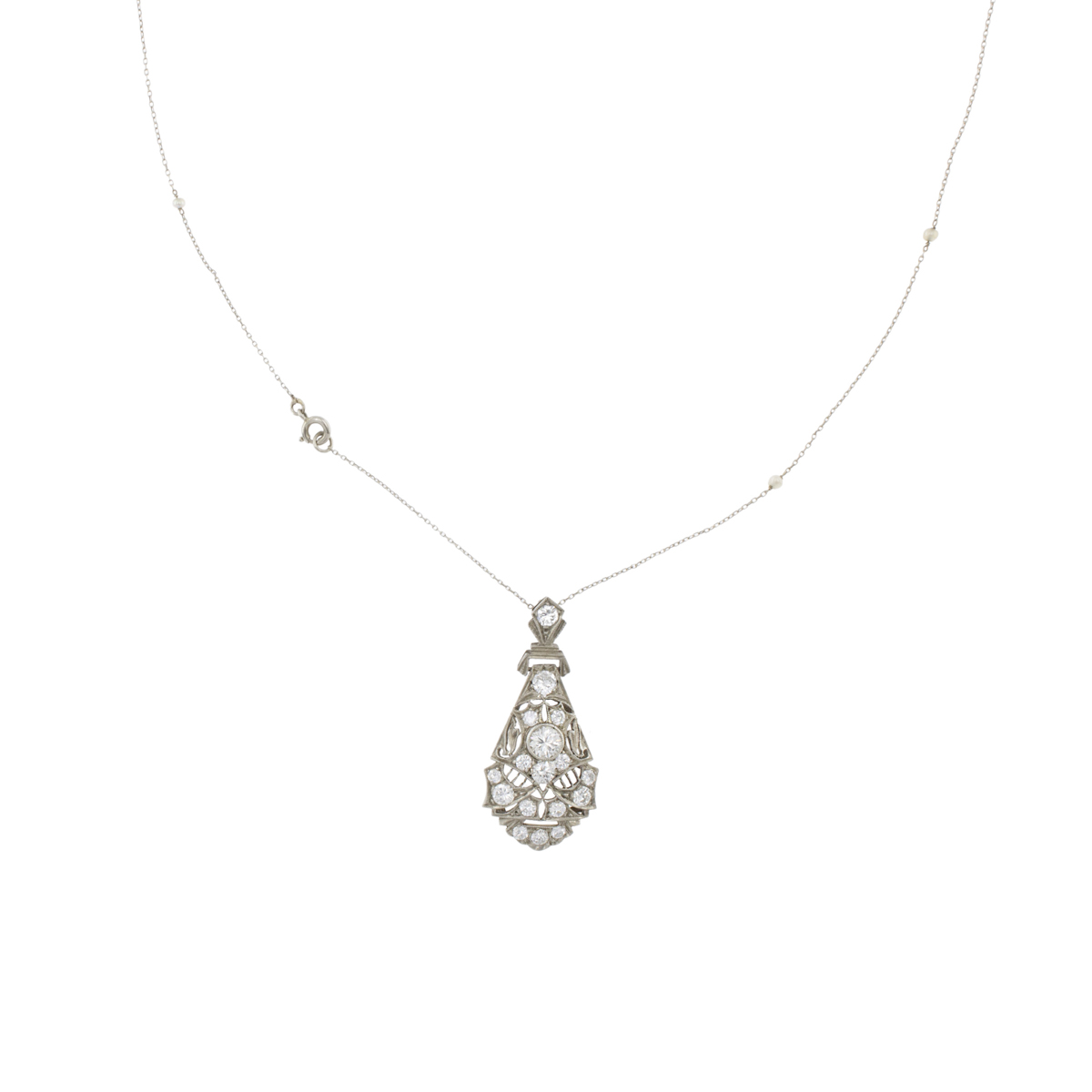 Antico pendente in oro bianco 12kt e diamanti primi 900 peso 4 gr. taglio brillante ct 0,90 circa, completo di catenina in platino e perline, lunghezza 50 cm.
