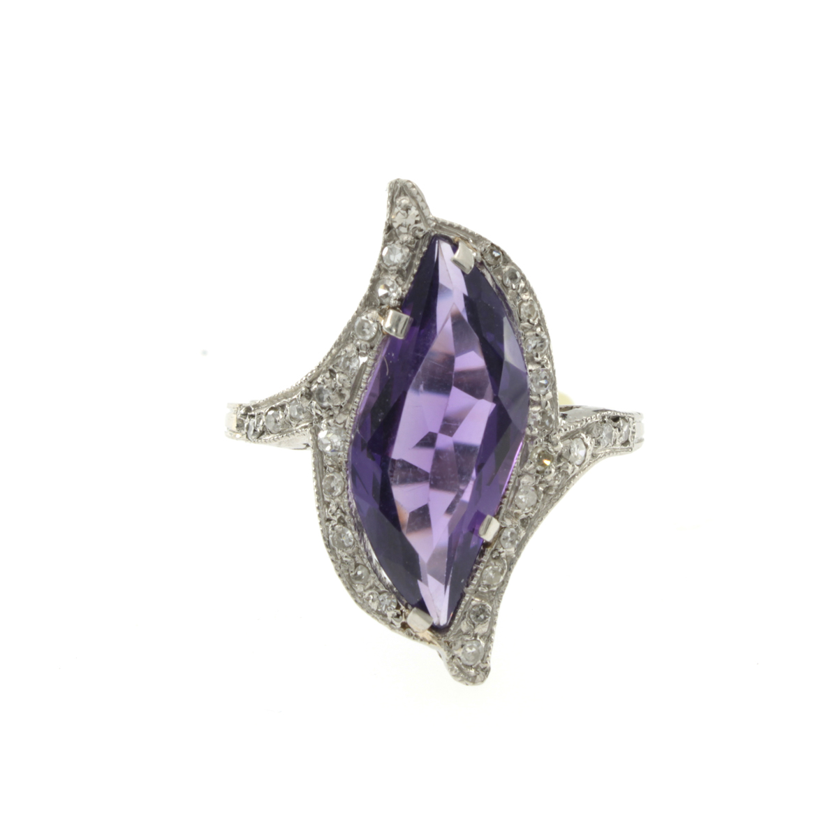 Anello in platino e ametista anni 30/40 peso 4 gr. taglio briolet contornato da diamanti taglio antico, misura 15,5