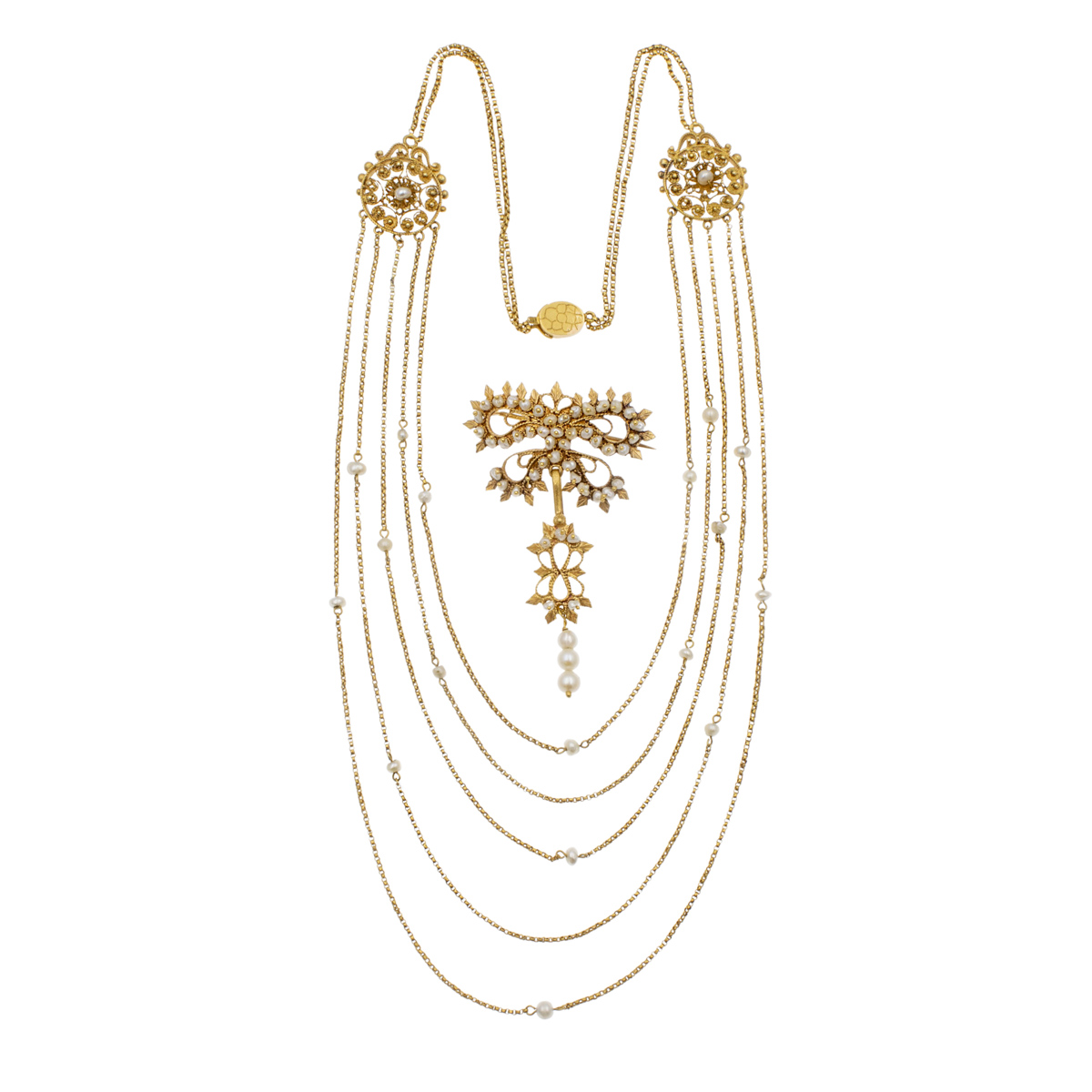 Collana e spilla in oro giallo 18kt primi '900 peso 14 gr. lavorato a filigrana con perline, collana lunghezza 39 cm. - spilla dimensioni 5,2x3,3 cm., il pendente é removibile