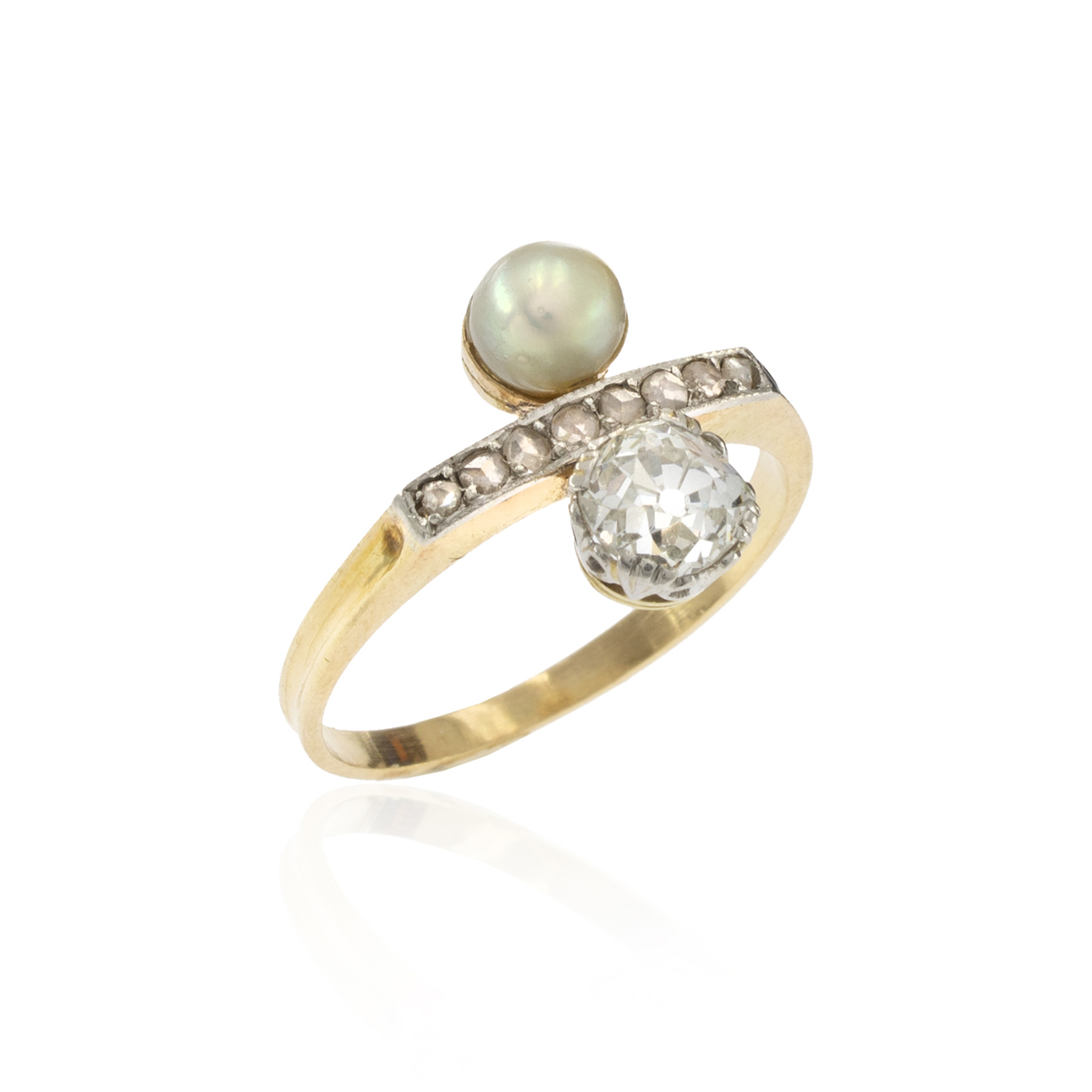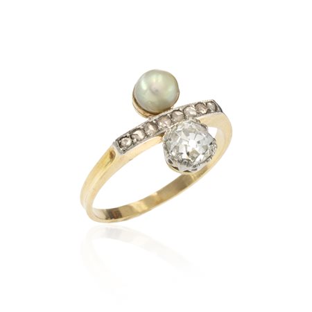 Antico anello in oro giallo 9 kt e argento primi 900 peso 3 gr. perlina e rosa coroné e rose di diamanti, misura 13