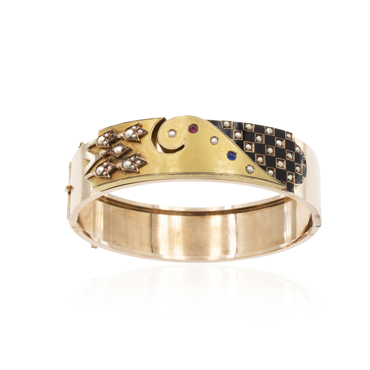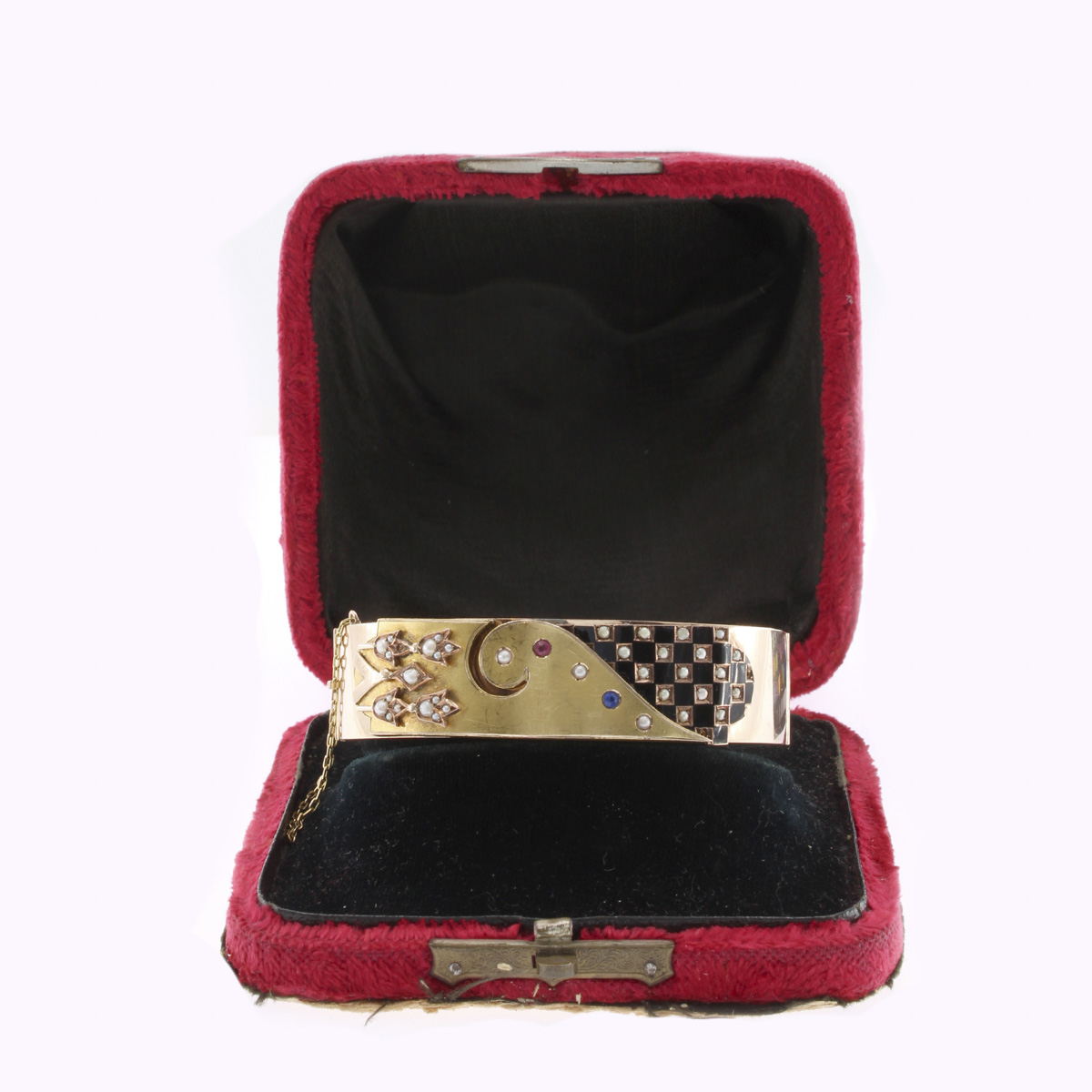 Antico bracciale a manetta in oro rosa e giallo 9kt primi 900 peso 20 gr. la parte superiore è impreziosita da zaffiro, rubino, perline e smalto nero, diametro 6 cm. lievi difetti, completo di scatola originale