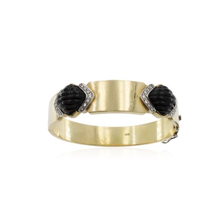 Bracciale a manetta in oro giallo 18kt e onice nero peso 61 gr. contornato da diamanti taglio brillante incastonati su oro bianco, chiusura a scatto, diametro 6 cm.