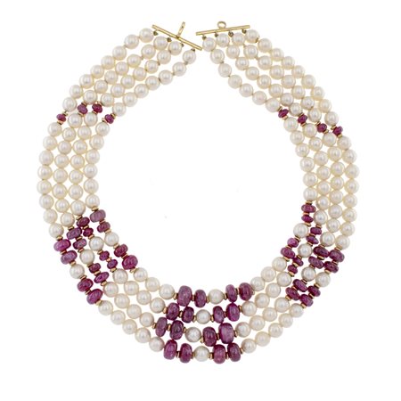 Collana a quattro fili di perle coltivate e rubini peso 151 gr.