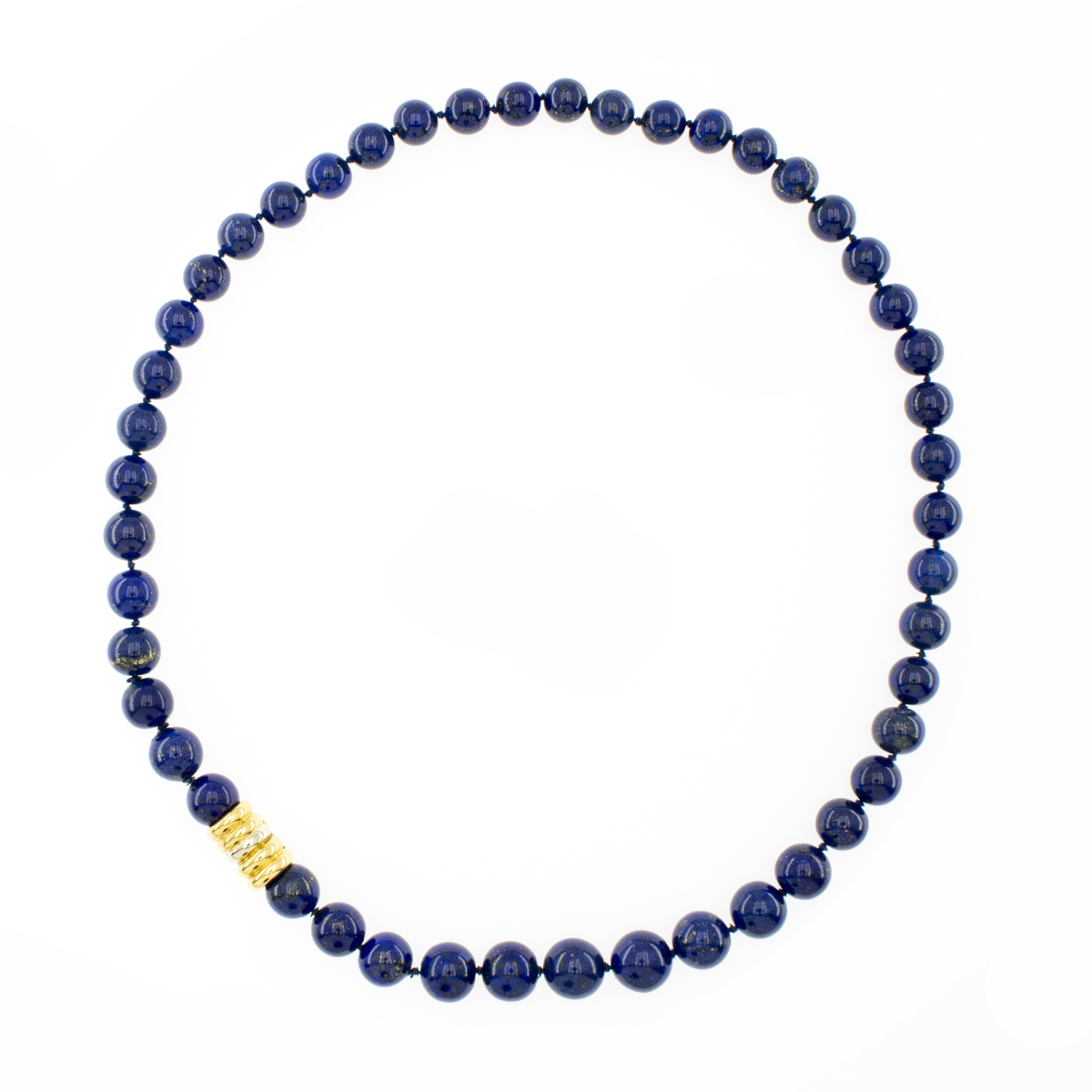 Collana ad un filo di lapislazzulo peso 103 gr. sfere da 10 a 12 mm. chiusura in oro a due colori 18kt, lunghezza 58 cm.