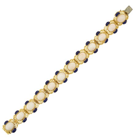 Bracciale in oro giallo 18kt corallo rosa peso 26 gr. taglio cabochon ovale e smalto blu, chiusura a scomparsa, lunghezza 18 cm.