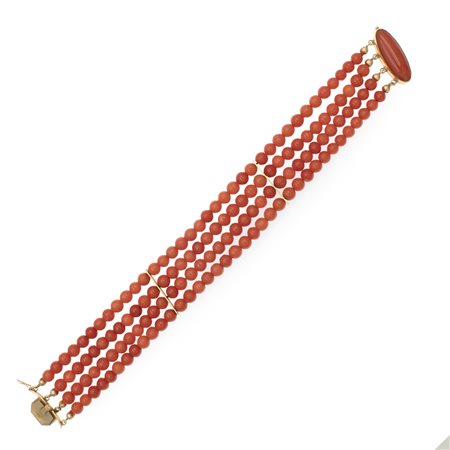 Bracciale in oro giallo 18kt e quattro fili di corallo rosso anni 40/50 peso 29 gr. sfere 5 mm. circa riunite da chiusura in oro giallo e corallo, lunghezza 19 cm.