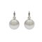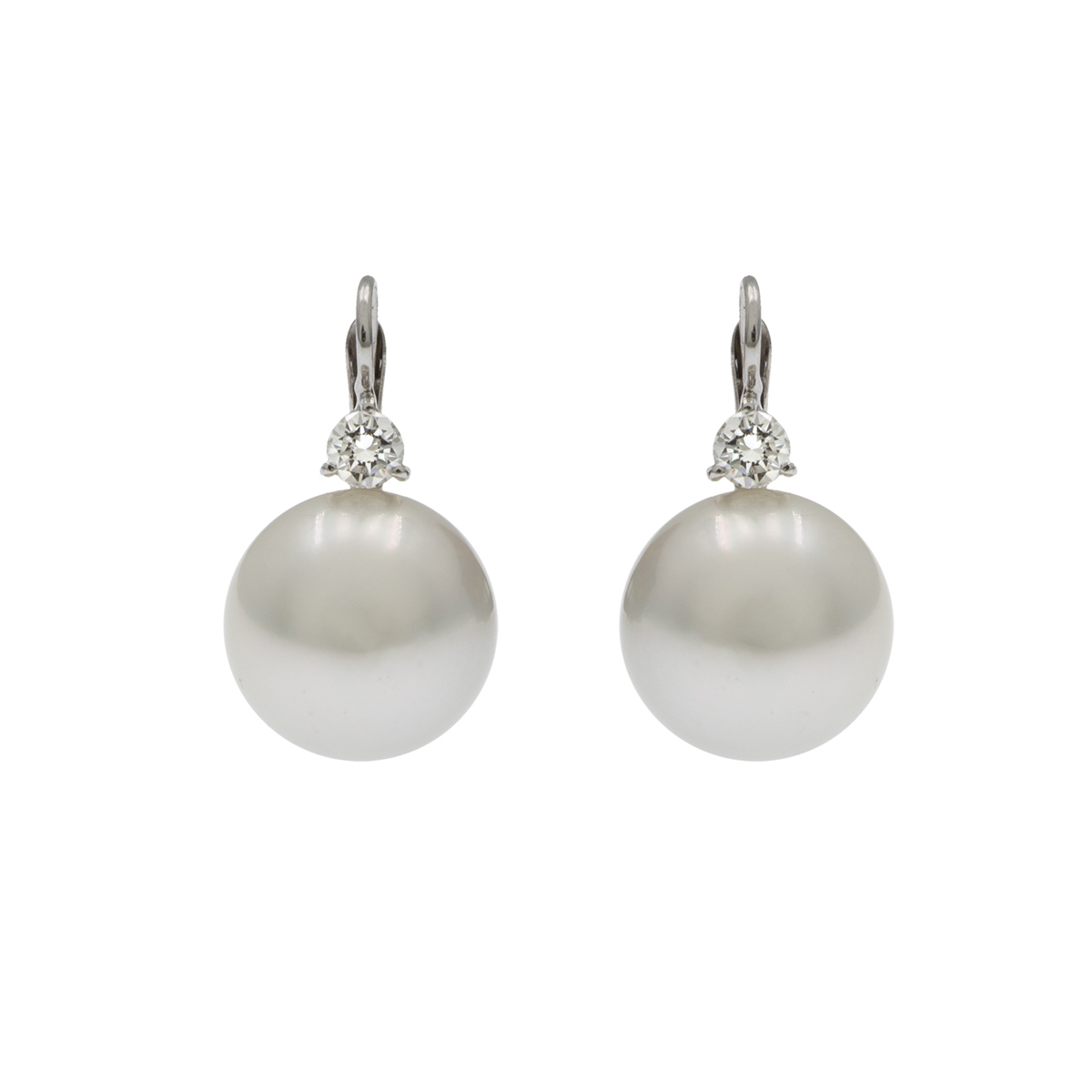 Orecchini a monachina in oro bianco 18kt peso 10 gr. perle australiane 14 mm. circa sormontate da due diamanti taglio brillante ct 0,48 circa, lunghezza 2,5 cm.