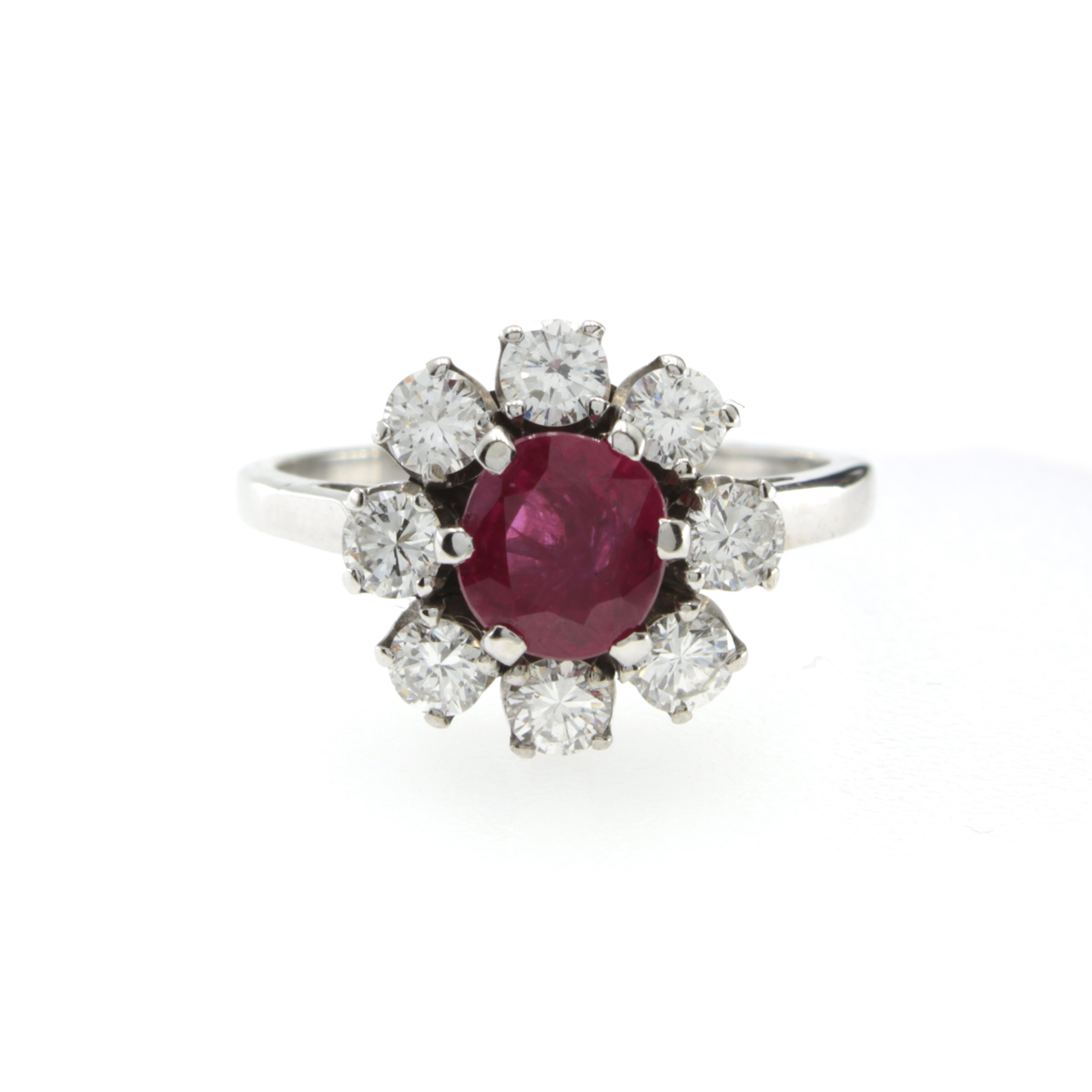 Anello in oro bianco 18kt rubino e diamanti peso 4 gr. rubino taglio ovale misto ct 0,80 circa contornato da diamanti taglio brillante ct 0,70 circa, misura 12