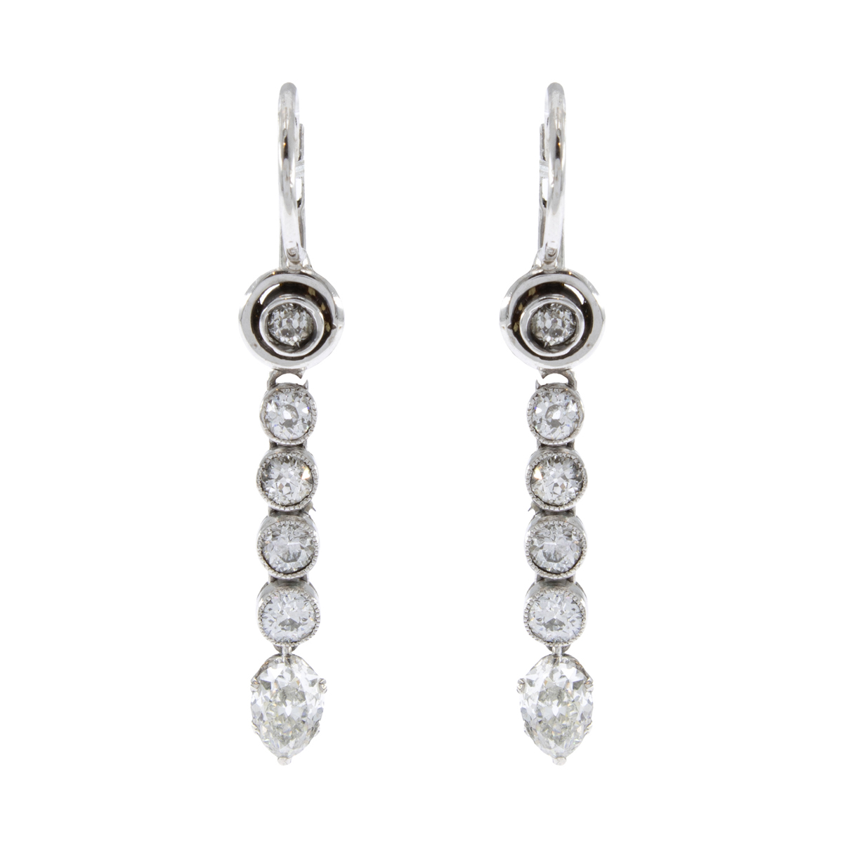 Orecchini pendenti in oro bianco 18kt e diamanti anni 30/40 peso 3 gr. taglio brillante e a goccia ct 0,80 circa, lunghezza 2,5 cm.