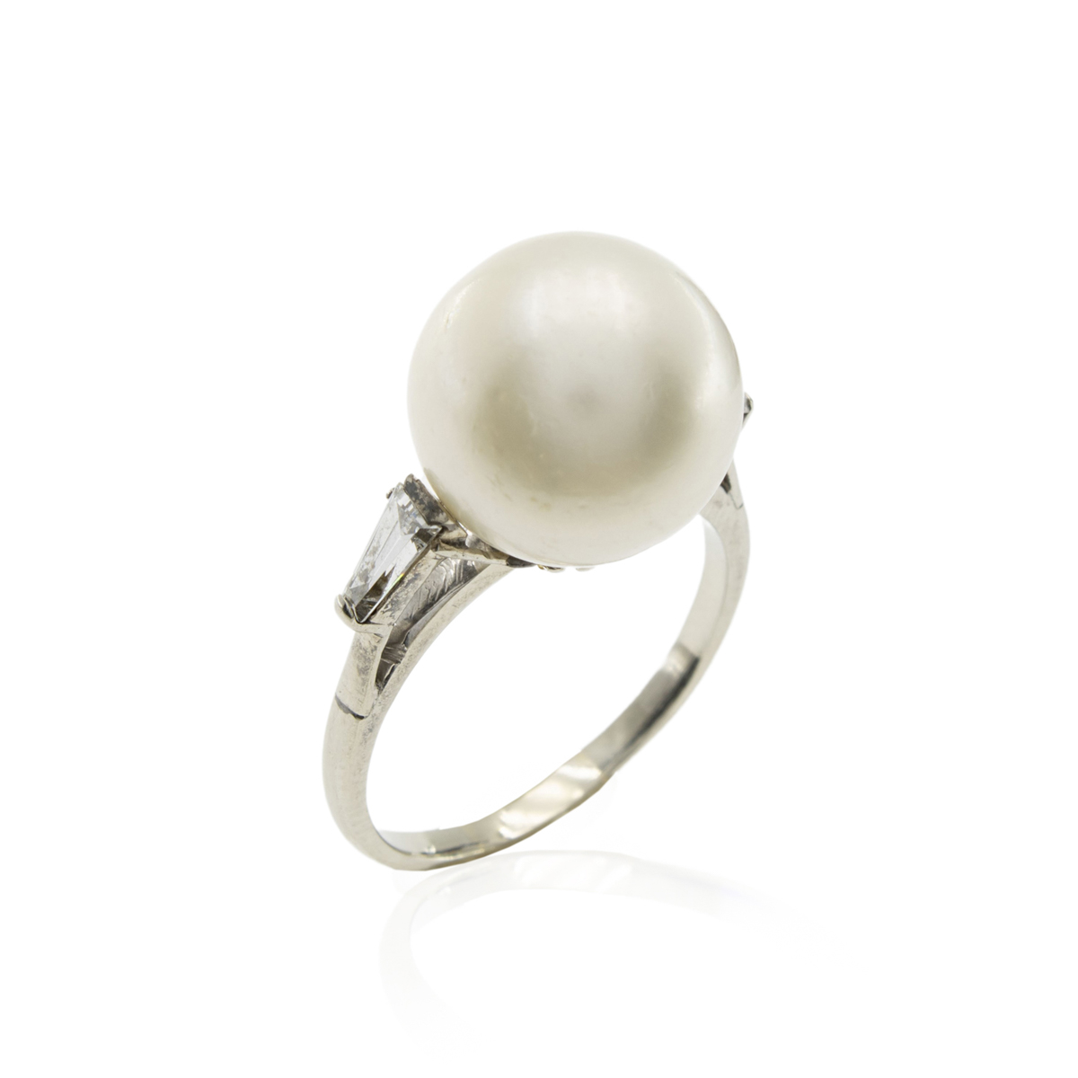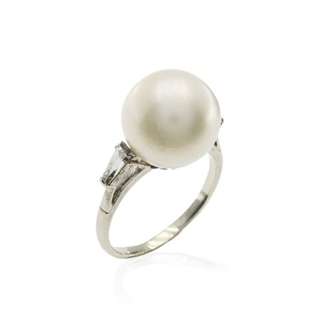 Anello in oro bianco 18kt perla coltivata peso 6 gr. 12,5 mm. circa ai lati due diamanti taglio tapper ct 0,15 circa, misura 15