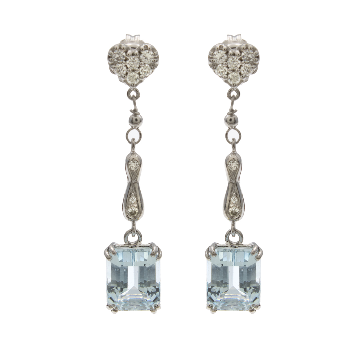 Orecchini pendenti in oro bianco 18kt con acquamarine peso 7 gr. taglio smeraldo sormontate da cuori con diamanti taglio brillante ct 0,40 circa, lunghezza 3,8 cm.