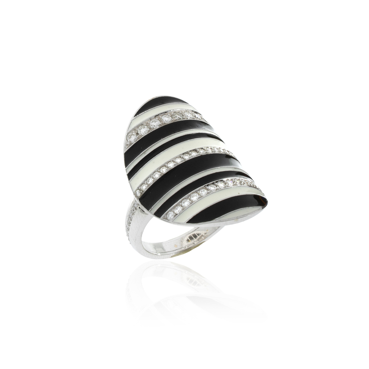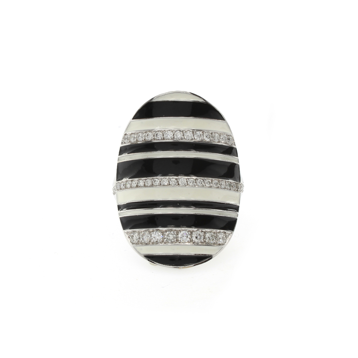 Anello in oro bianco 18kt e titanio peso 8 gr. diamanti taglio brillante ct 0,65 circa alternati da smalto nero e bianco, misura 14