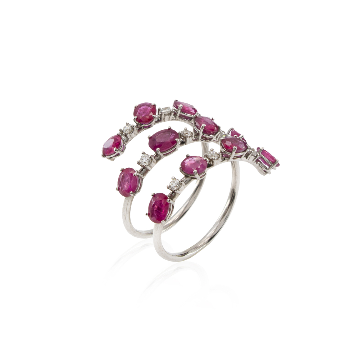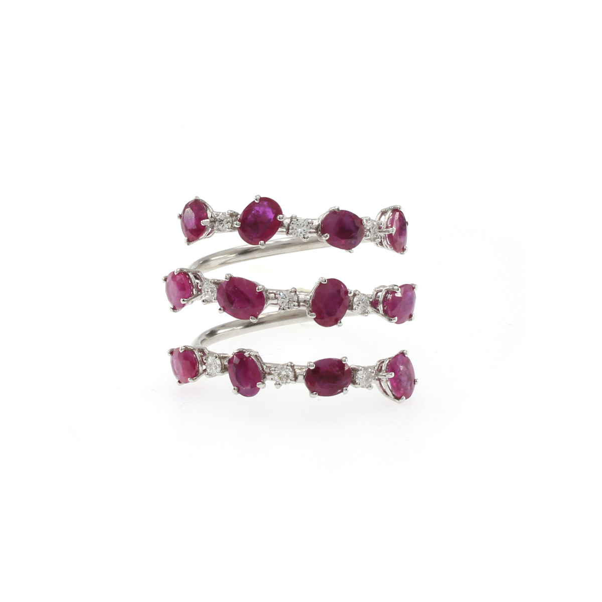 Anello tre riviere in oro bianco 18kt peso 4 gr. rubini taglio ovale ct 2,70 circa e diamanti taglio brillante ct 0,20 circa, misura 14