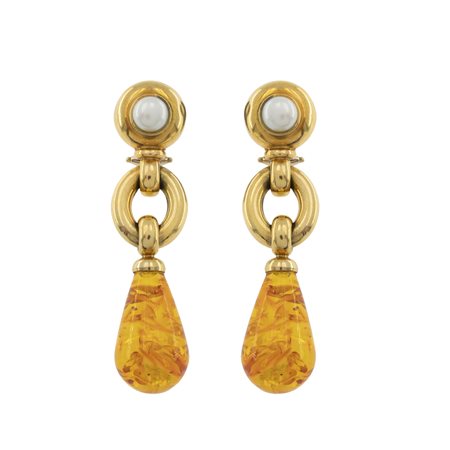 Orecchini pendenti in oro giallo 18kt perle e ambra peso 18 gr. tagliata a pera, lunghezza 6 cm.
