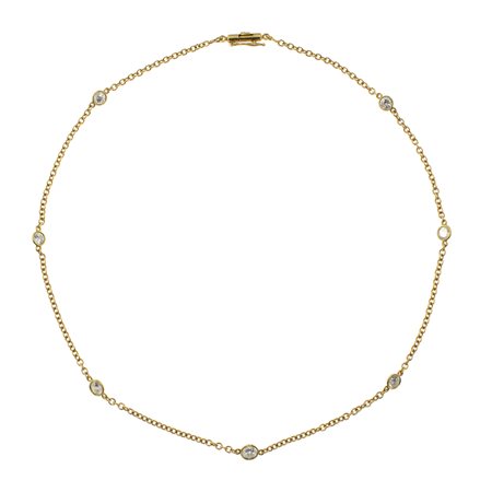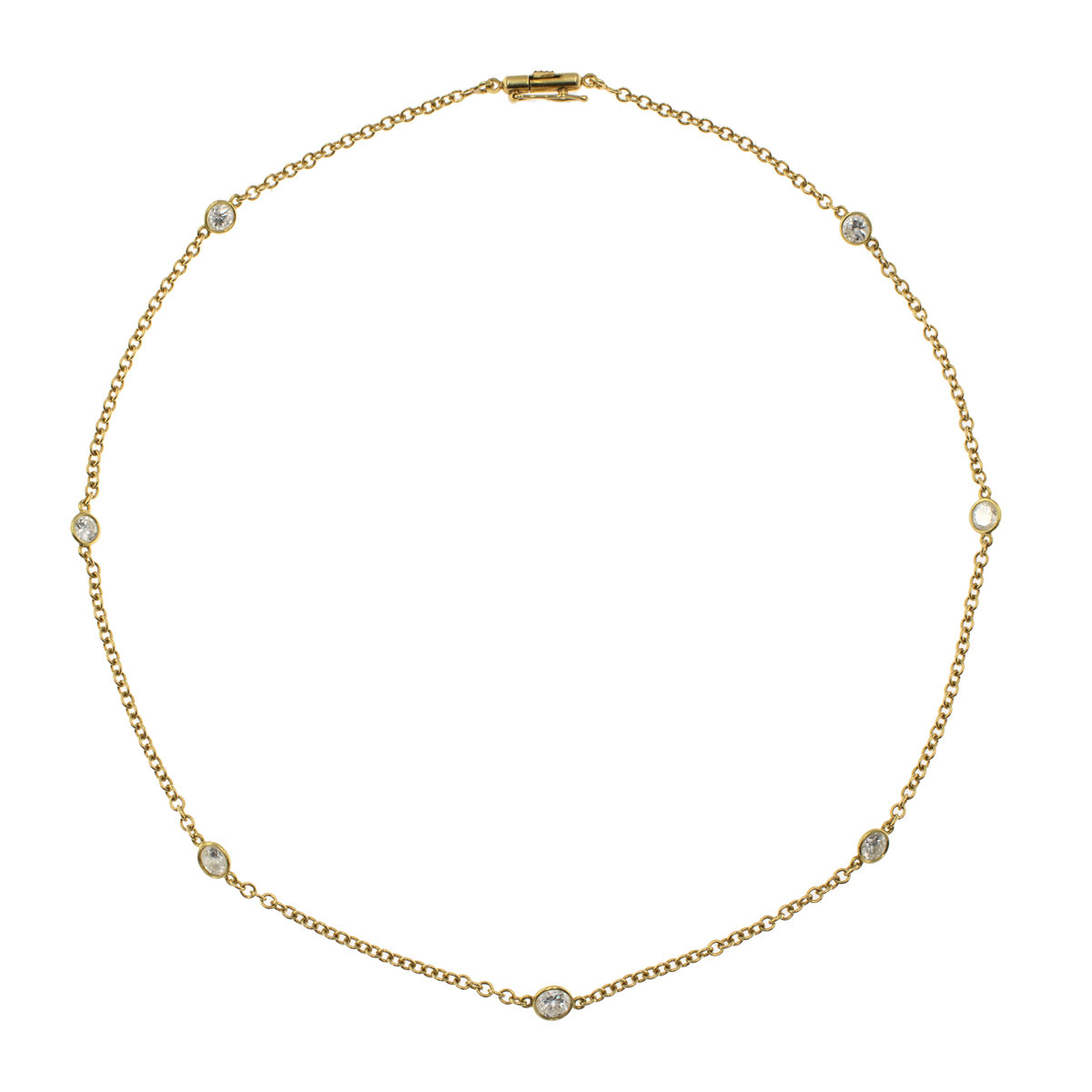 Collana in oro giallo 18kt con sette diamanti peso 8 gr. taglio brillante ct 1,50 circa, lunghezza 43 cm.