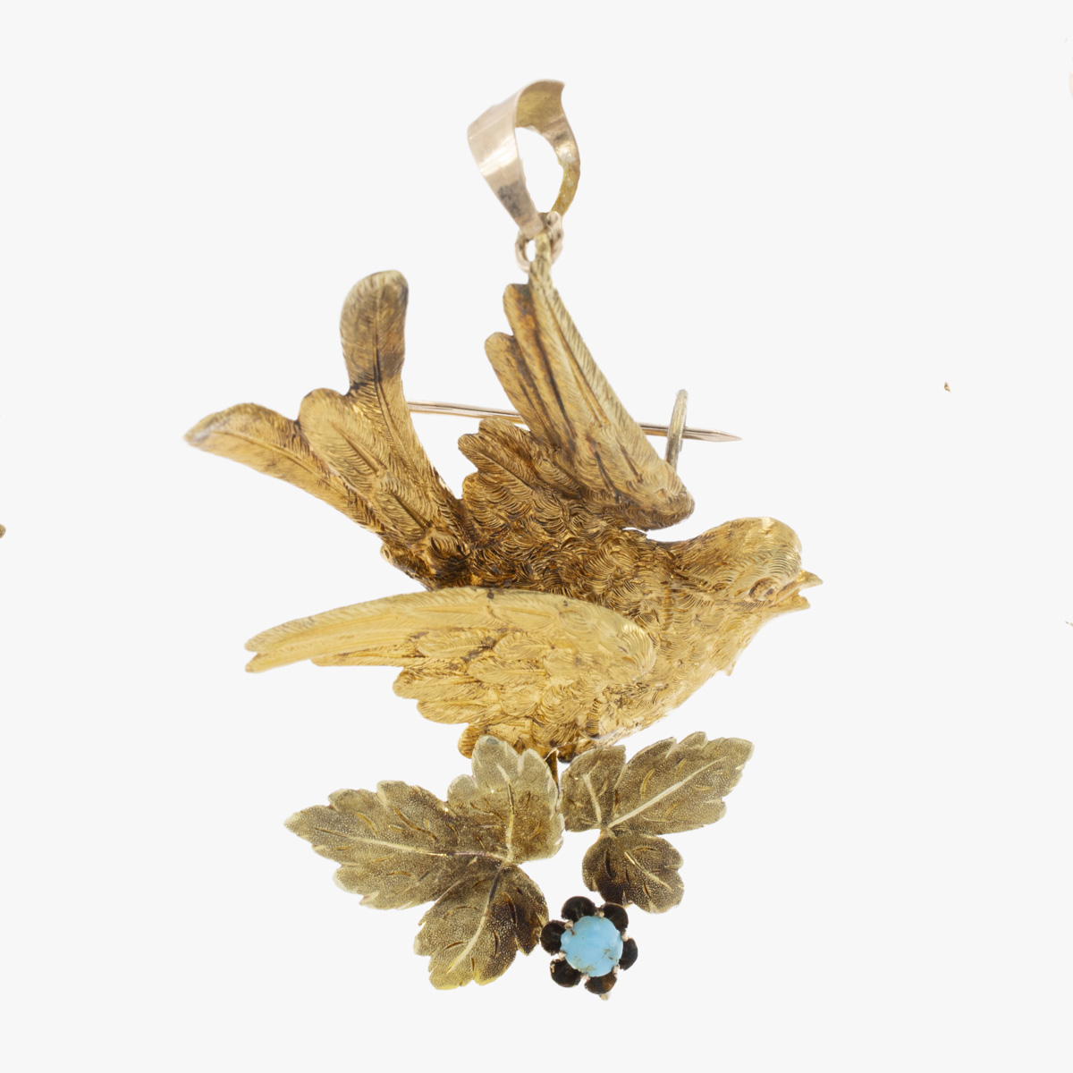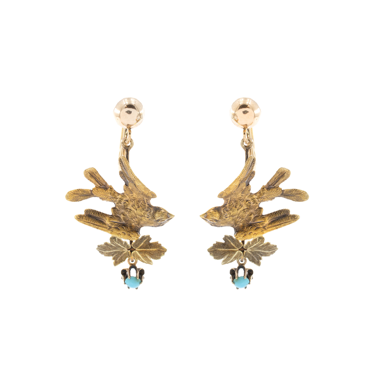 Antica parure colombi in oro giallo 9kt e turchesi primi '900 peso 9 gr. composta da spilla - pendente, dimensioni 5x4 cm. e orecchini pendenti a monachina, lunghezza 4 cm.