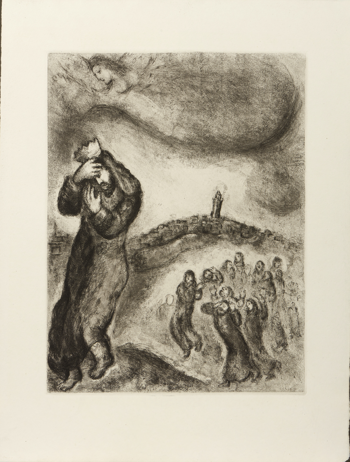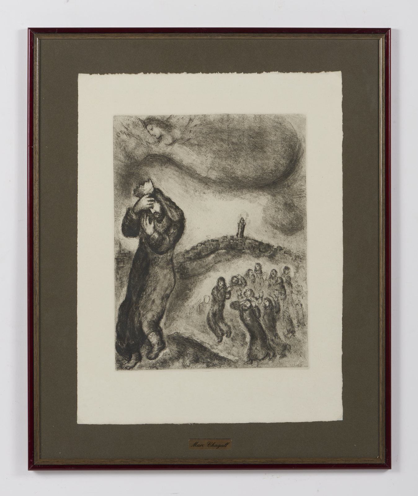 CHAGALL MARC (1887 - 1985) Dalla serie La Bible: David Montant la Colline des Oliviers. Acquaforte. Cm 33,80 x 44,30. Firma in lastra in basso a destra. Dimensioni lastra:24,3x32,2 cm. Filigrana Montval in basso a destra. Edizione totale: 295 esemplari (275 + 20 fuori commercio). Pubblicazione: C. Sorlier, Marc Chagall et Ambroise Vollard, Editions Galerie Matignon, Paris, 1981, n. 269. Cornice presente