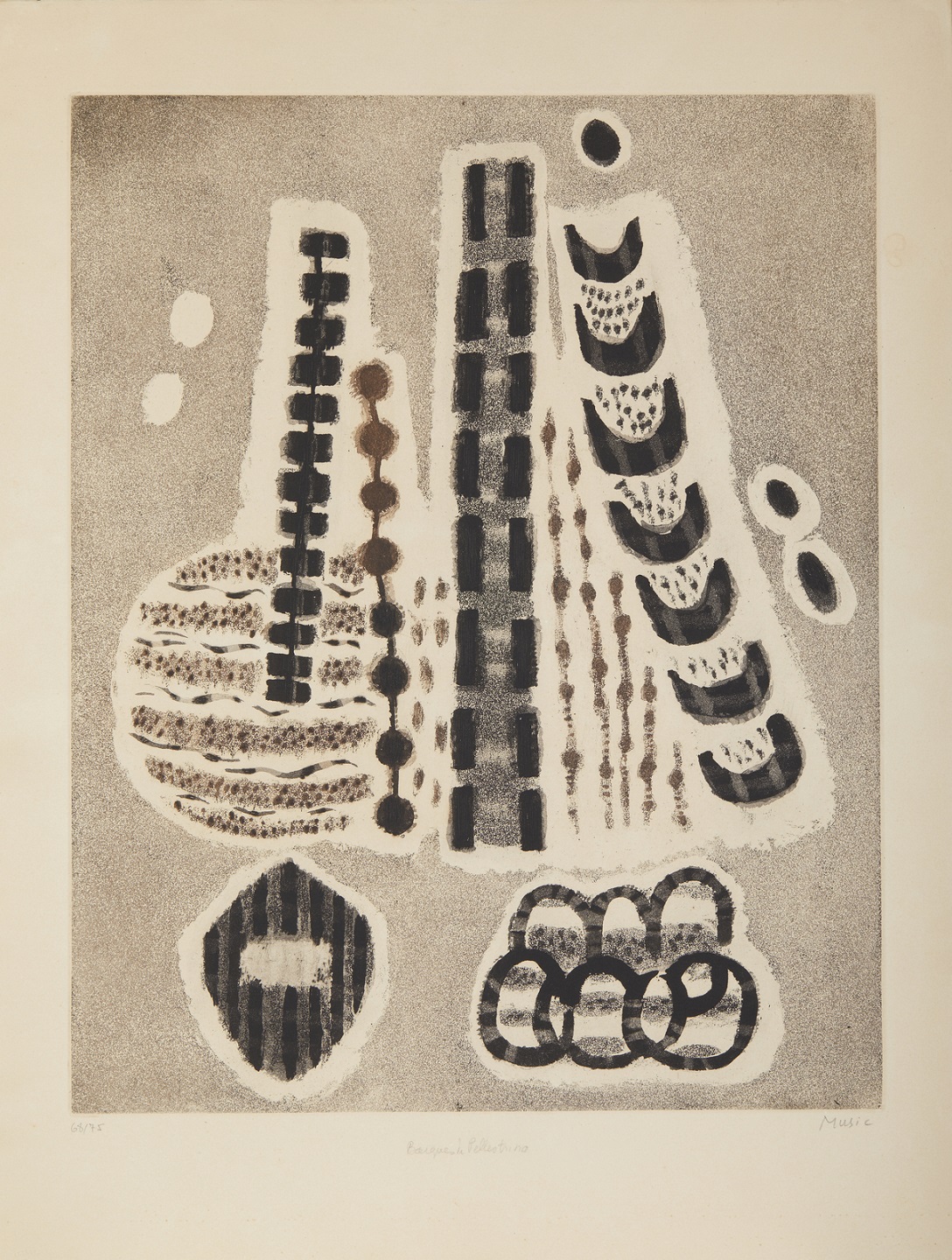 MUSIC ANTONI ZORAN (1909 - 2005) Barques de Pallestrina. 1957. Acquaforte. Cm 50,00 x 66,00. 68/75. Tiratura, firma e titolo in basso a matita. Dimensioni lastra: 52,5x41,5 cm. Edizione totale: 75 esemplari. Stampatore: Atelier Lacouriere et Frelaut, Paris. Timbro a secco Atelier Lacouriere et Frelaut, Paris, Pubblicazione: Music, das graphische Werk 1947 - 1981, Schmücking, 1986, n.66.