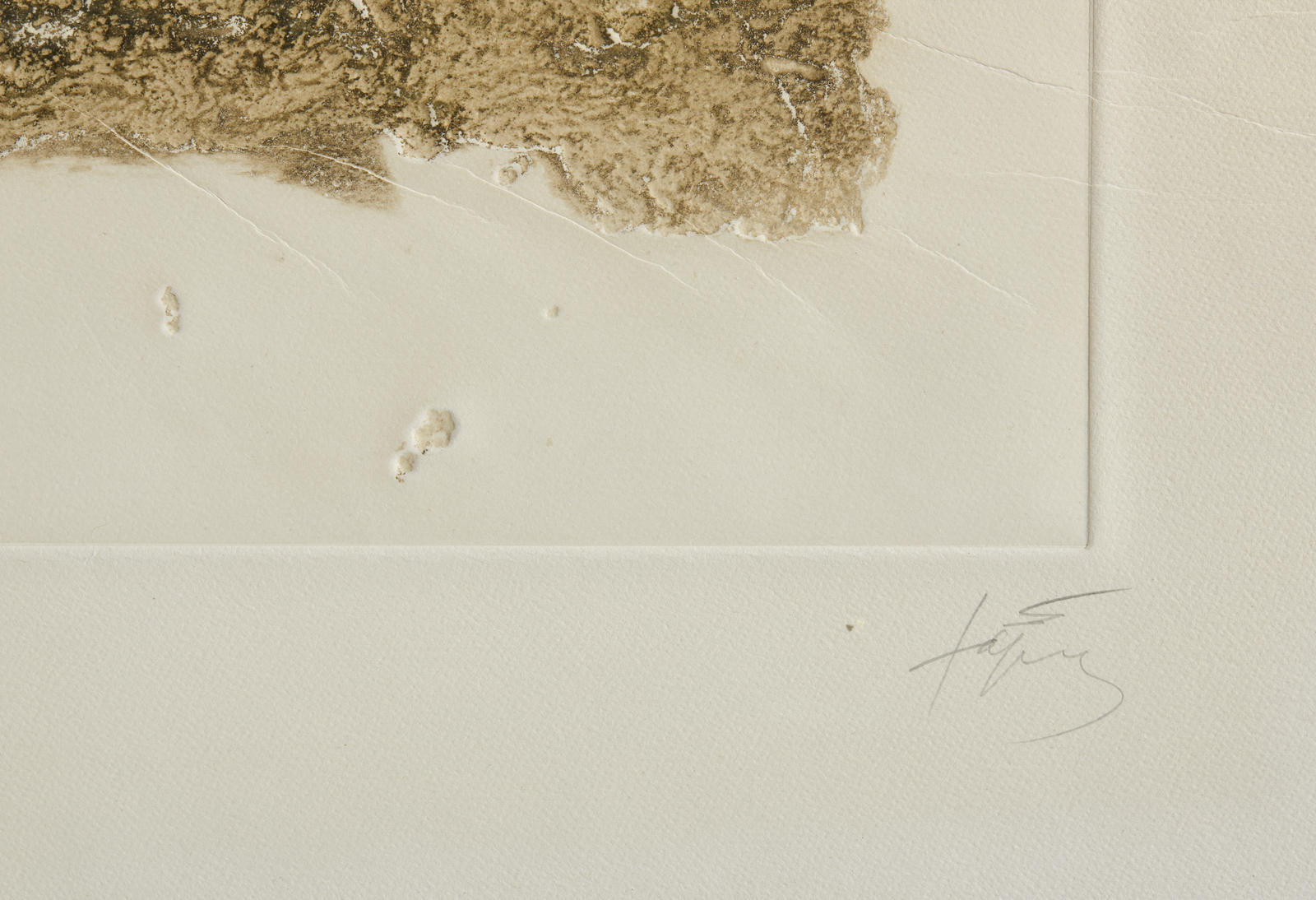 TAPIES ANTONI (1923 - 2012) Senza titolo VI. 1971. Acquaforte e tecnica mista con polvere di marmo. Cm 76,50 x 62,50. 80/100. Tiratura e firma in basso a matita. Dimensione lastra: 49x64.5 cm. Pubblicazione: L'oeuvre gravé, 1947-72", Vol. I, a cura di M.Galfetti, Ed. Erker, 1975, n. 250. Lievi difetti.