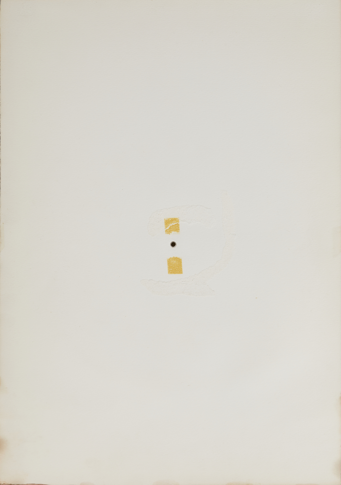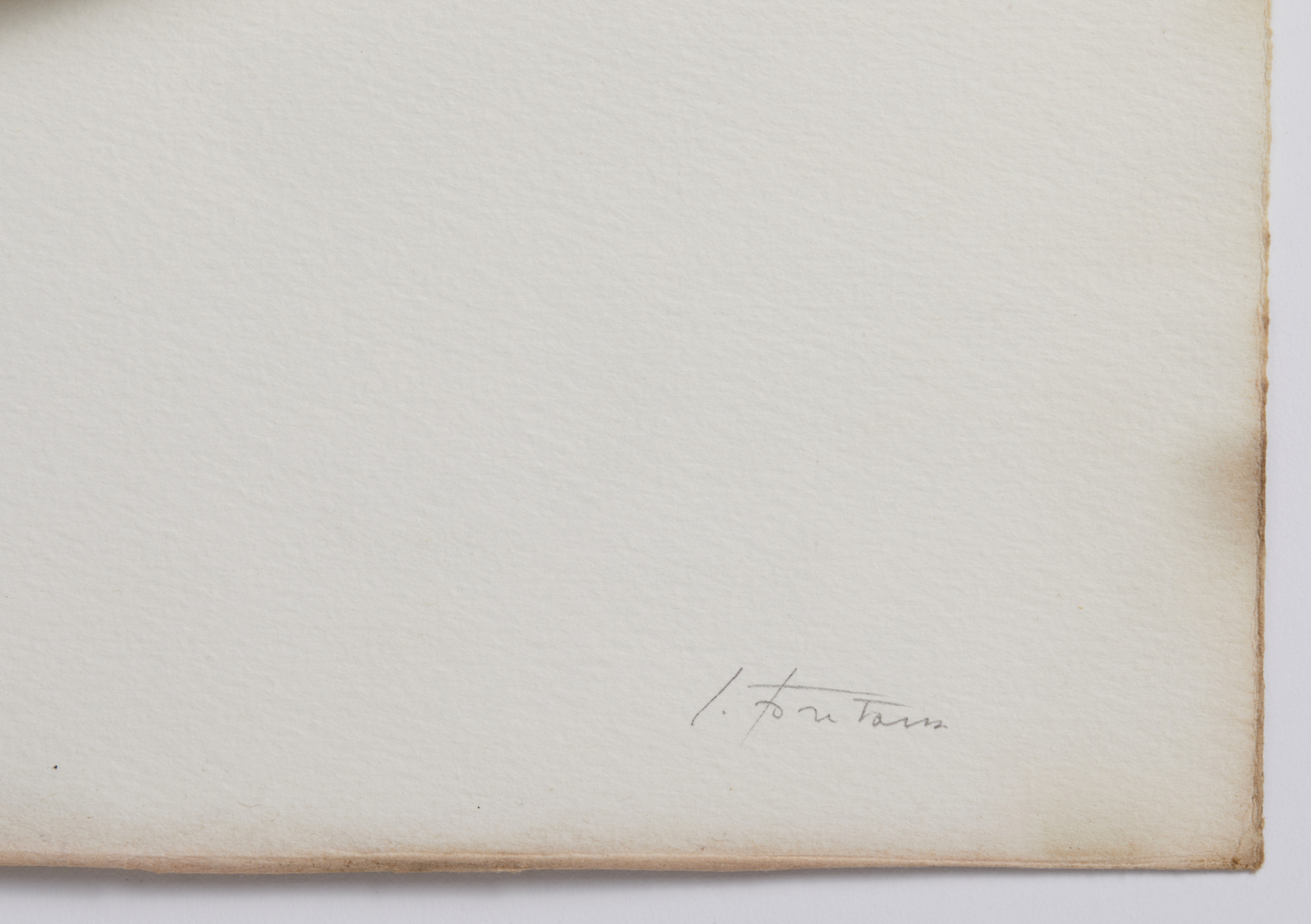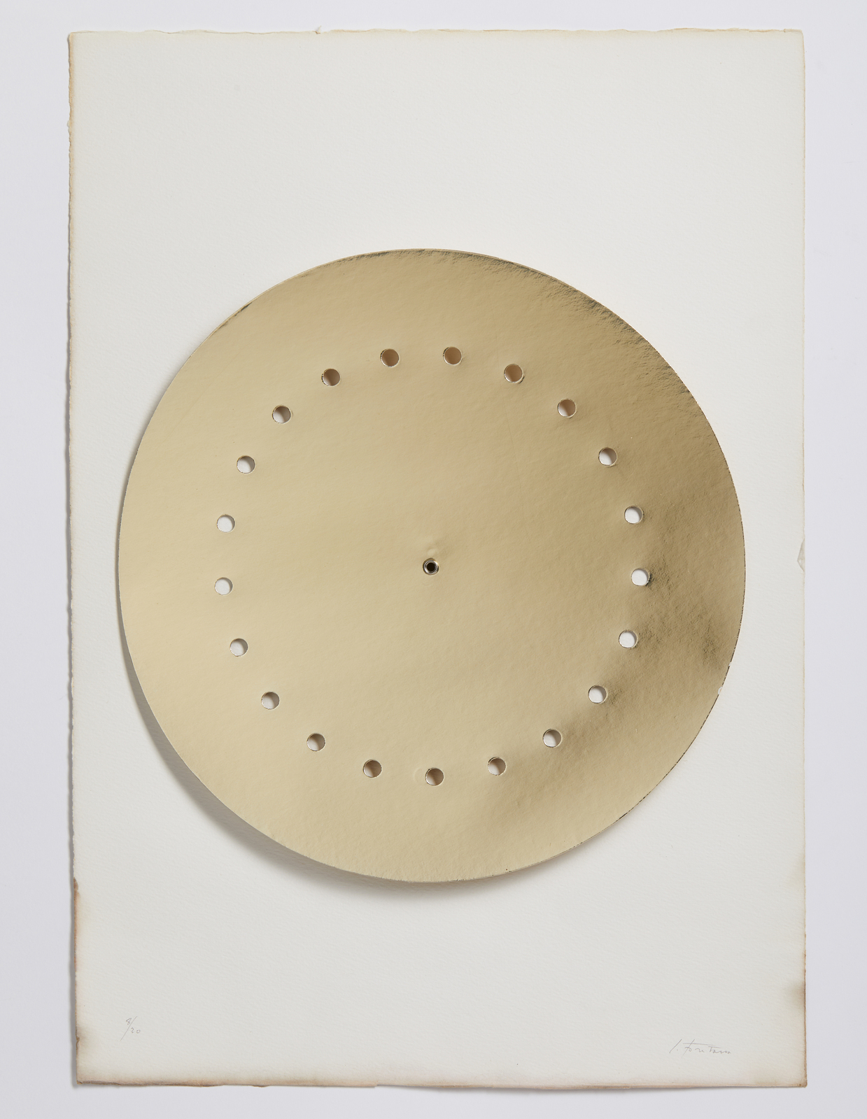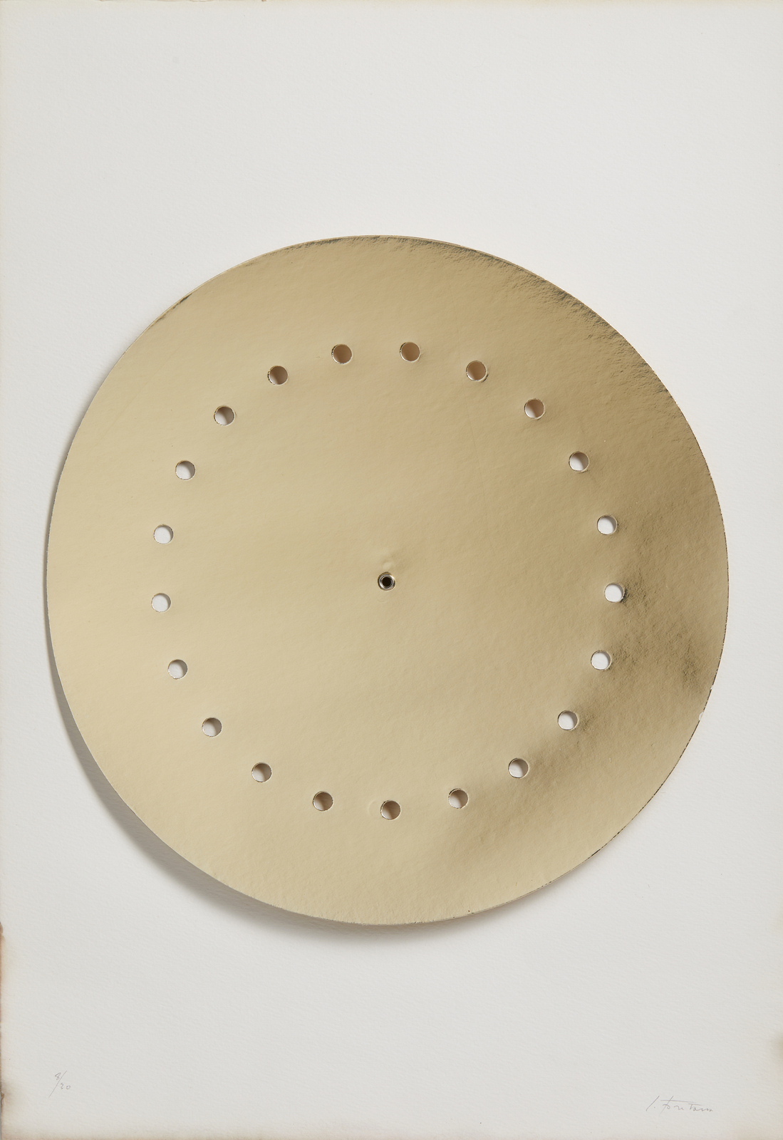 FONTANA LUCIO (1899 - 1968) Disco spaziale (oro). Tecnica mista su carta. Cm 35,00 x 50,00. 1966-1967. 8/30. Tiratura e firma in basso a matita. Disco in lamina sintetica dorato con 21 buchi applicato su cartoncino. Stampatore G. Upiglio, Milano; Editore Edizioni della Quercia. Dimensione disco: 30x30 cm. L'opera fu realizzata per un’edizione collettiva alla quale Lucio Fontana, Heinz Mack, Gunther Uecker e Nanda Vigo contribuirono con tre opere ciascuno; l’edizione conteneva anche un testo poetico di Nanni Balestrini. Pubblicazione: Lucio Fontana. Incisioni, grafica, multipli, pubblicazioni... a cura di H. Ruhè, C. Rigo, Edizioni Reverdito, 2007, p.152, n°M-4, dove viene indicata una tiratura di 21 esemplari + 9 in numeri romani. Lievi difetti.