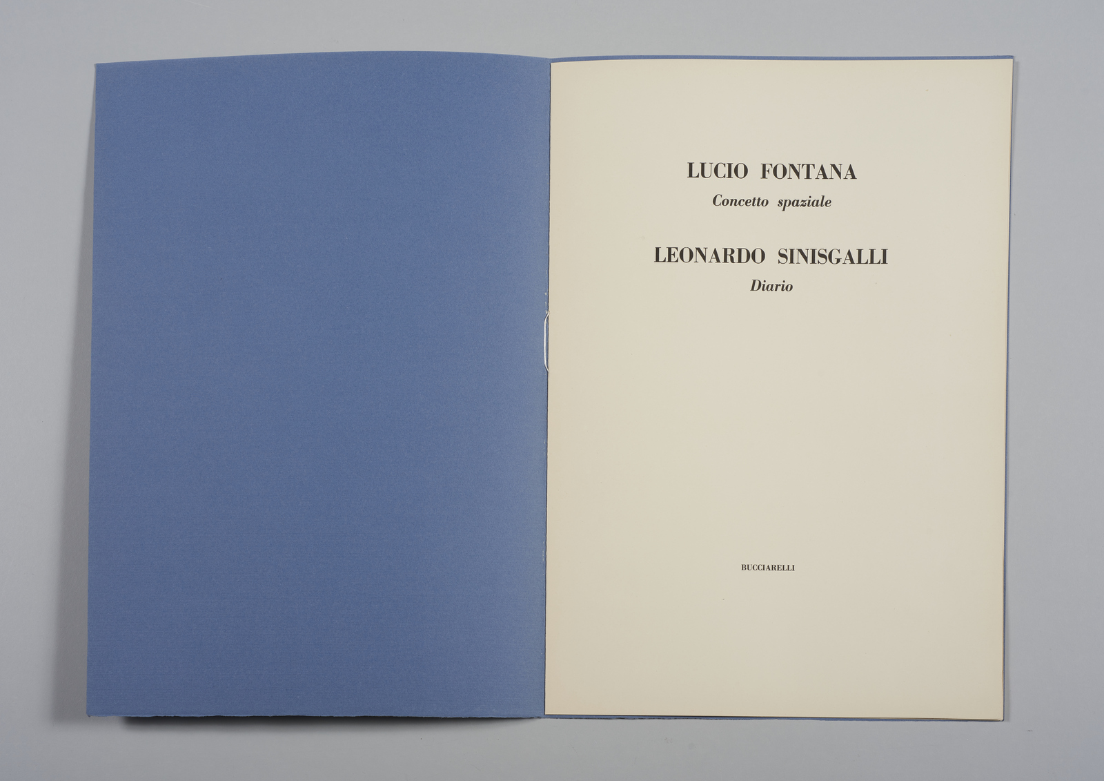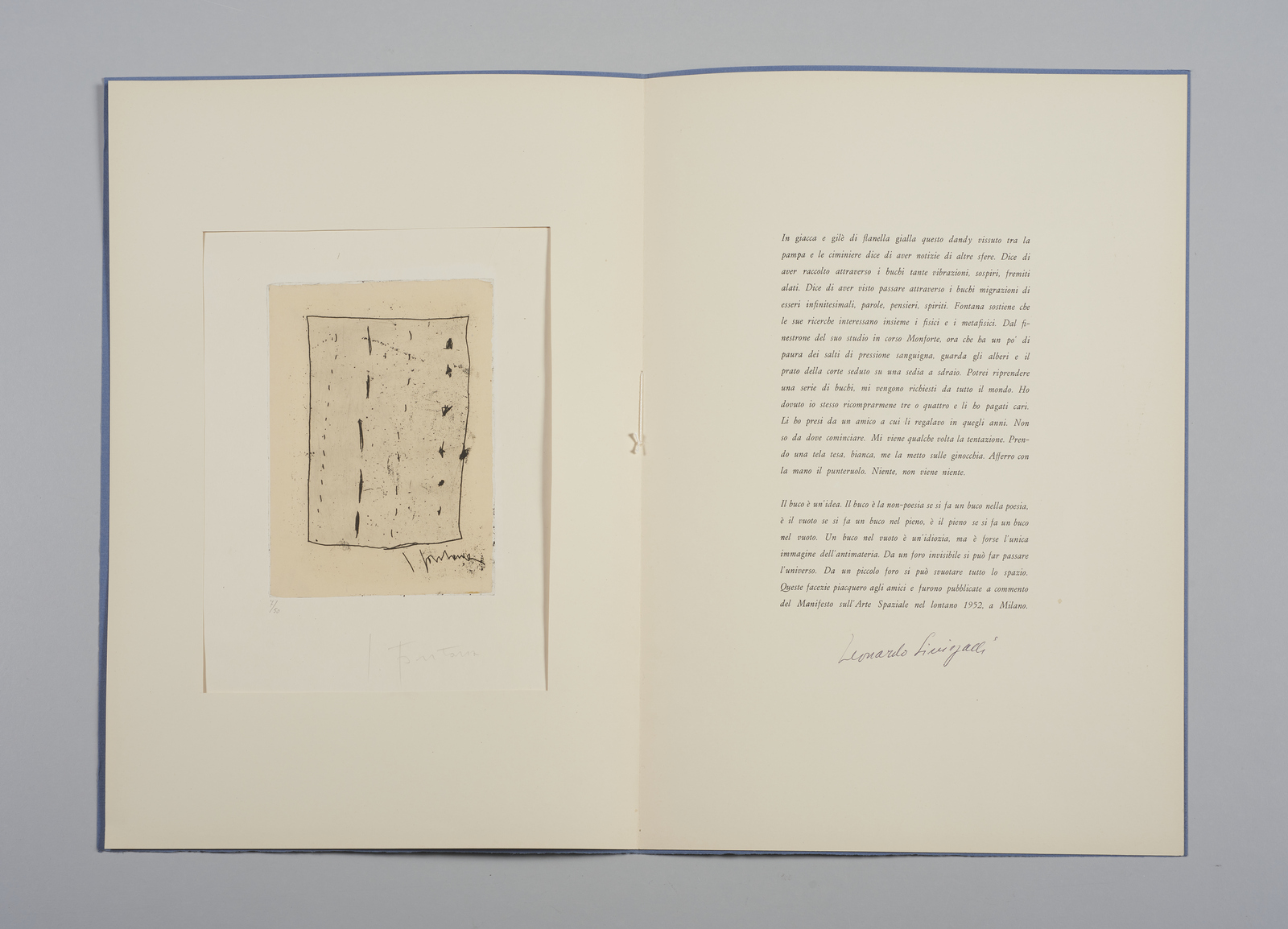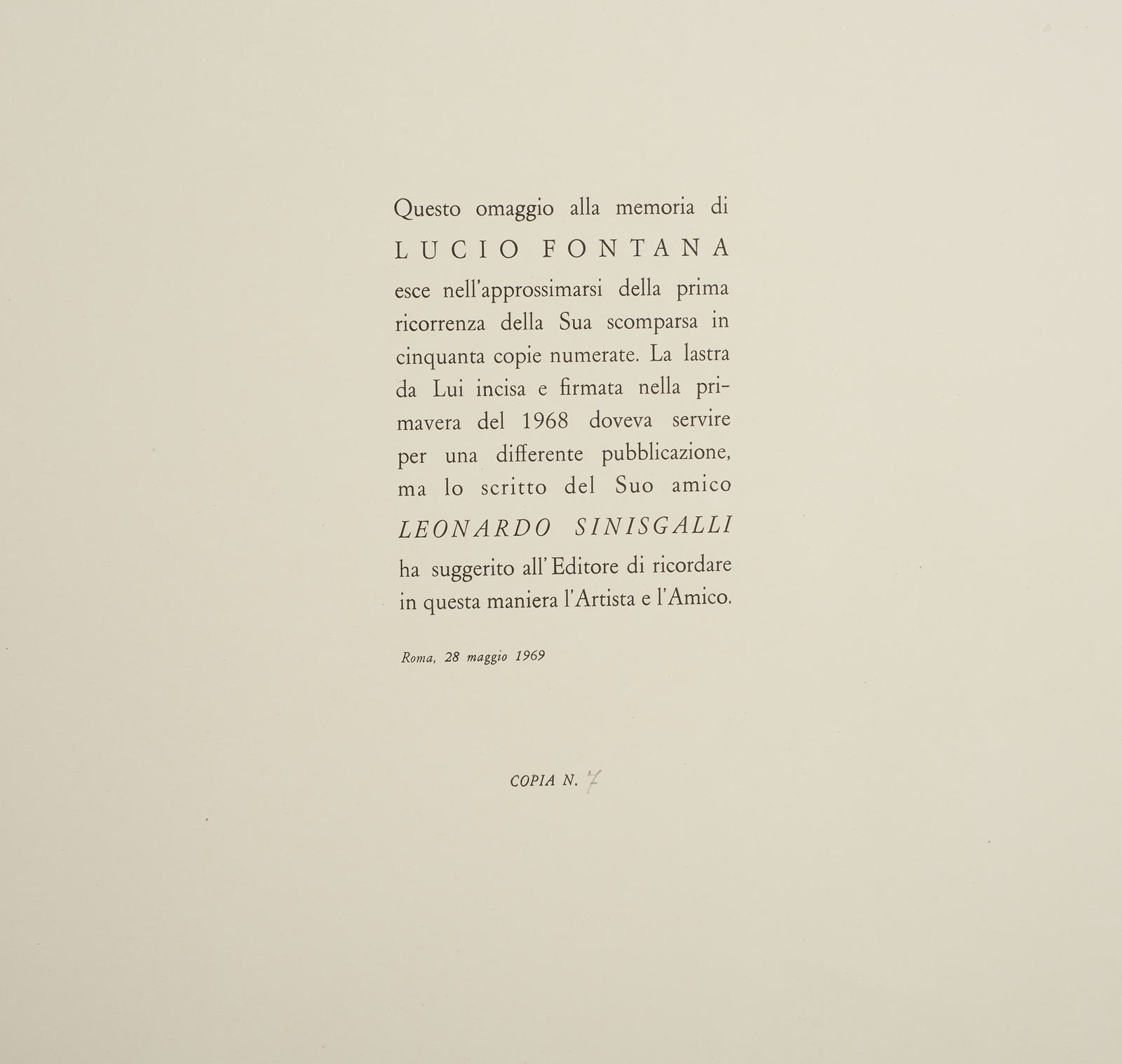 Volume contente un'incisione originale di Lucio Fontana. La lastra incisa e firmata dall'artista nella primavera del 1968 doveva servire per una differente pubblicazione, ma lo scritto del suo amico Leonardo Sinisgalli, ha suggerito all'editore di ricordare, in questa maniera, l'artista e l'amico. Bucciarelli editore.