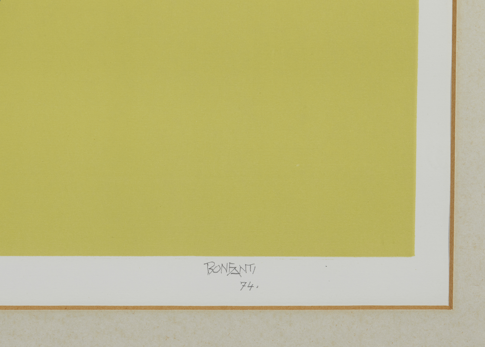 BONFANTI ARTURO (1905 - 1978) Senza titolo. 1974. Serigrafia. Cm 56,30 x 46,50. 58/90. Tiratura, firma e anno in basso a matita. Dimensioni lastra:40,5 x 34 cm. Cornice presente