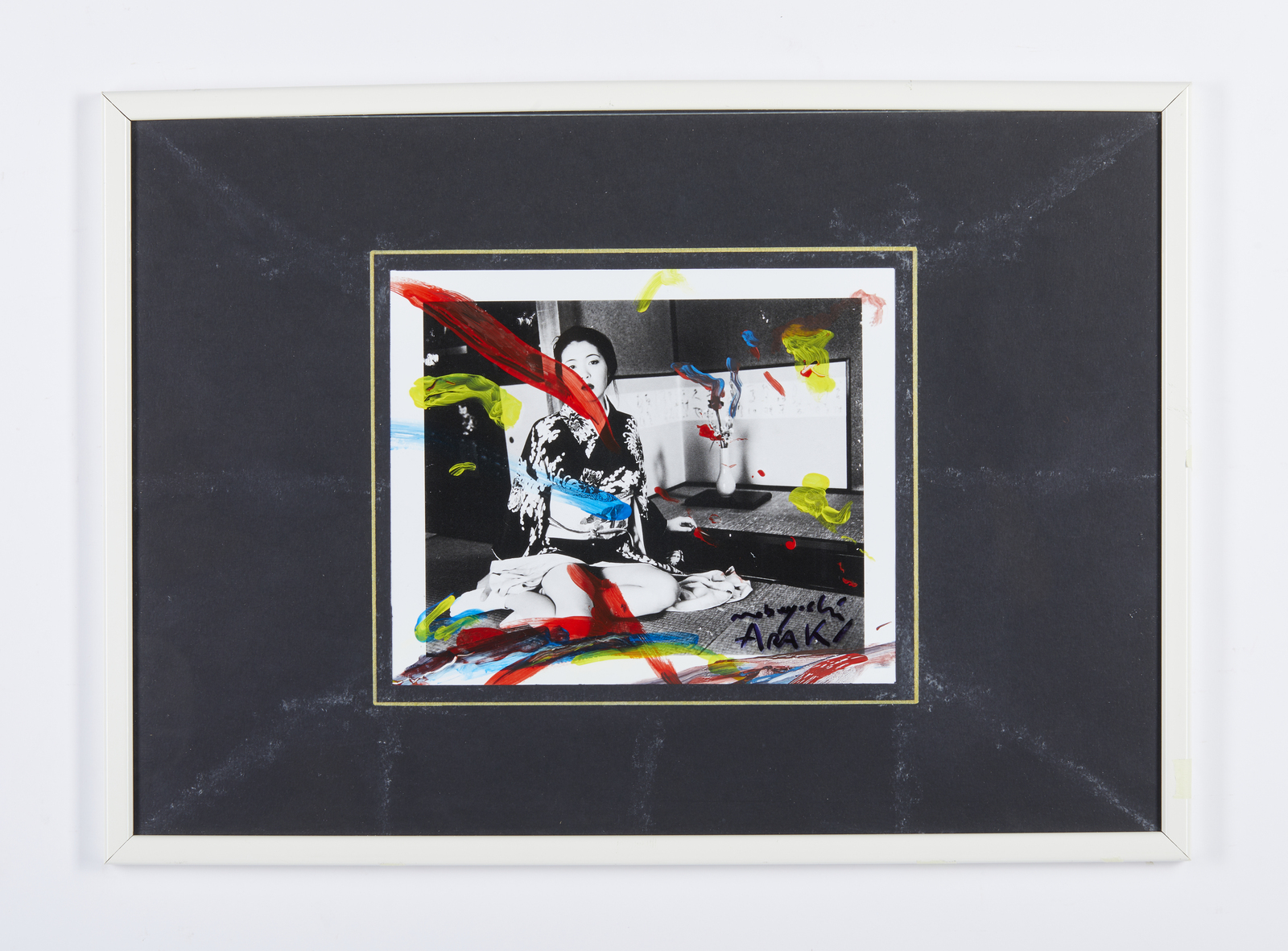 ARAKI NOBUYOSHI (n. 1940) Senza titolo. Intervento su fotografia. Cm 24,80 x 21,00. Firma in basso a destra. Al retro firma ed etichetta Kunstatelier Sir Morgan, Heidelberg. Certificato di provenienza Kunstatelier Sir Morgan, Heidelberg, riportante il relativo numero d'inventario. Provenienza: Kunstatelier Sir Morgan, Heidelberg; Collezione privata, Messina. Cornice presente