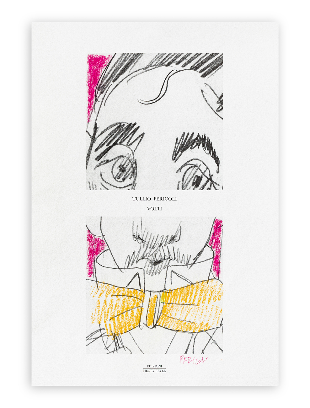Intervento a pastelli colorati su manifesto 'Tullio Pericoli - Volti - Edizioni Henry Beyle'