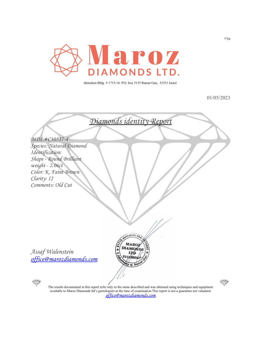DIAMANTE 2,06 CARATI COLORE K - PUREZZA I2 - TAGLIO BRILLANTE - CERTIFICATO GEMMOLOGICO MAROZ DIAMONDS LTD MEMBRO ISRAEL DIAMOND EXCHANGE - C30517-4
