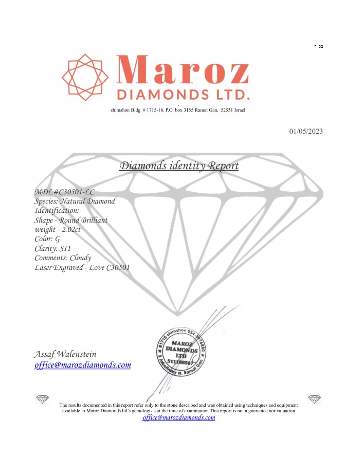 DIAMANTE 2,02 CARATI COLORE G - PUREZZA SI1 - TAGLIO BRILLANTE - INCISO AL LASER - CERTIFICATO GEMMOLOGICO MAROZ DIAMONDS LTD MEMBRO ISRAEL DIAMOND EXCHANGE - C30501-LC