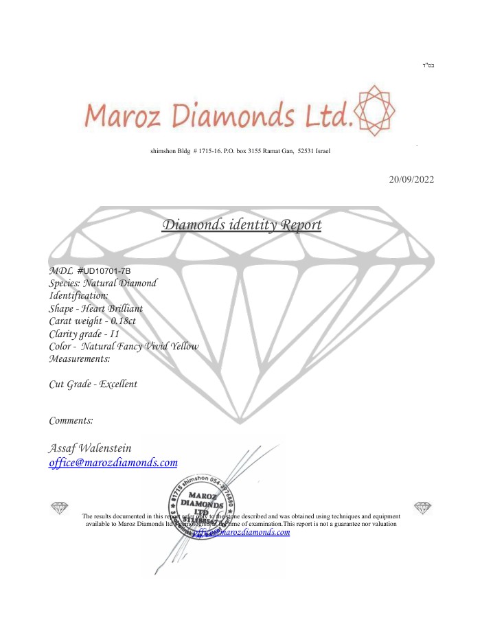 DIAMANTE NATURAL POLISHED 0,18 CARATI COLORE FANCY GIALLO VIVIDO - PUREZZA I1 - TAGLIO CUORE - CERTIFICATO GEMMOLOGICO MAROZ DIAMONDS LTD MEMBRO ISRAEL DIAMOND EXCHANGE - UD10701-7B