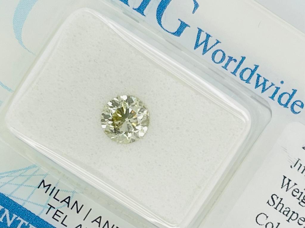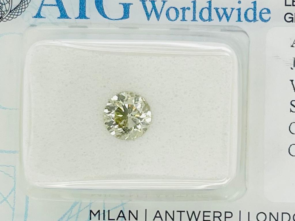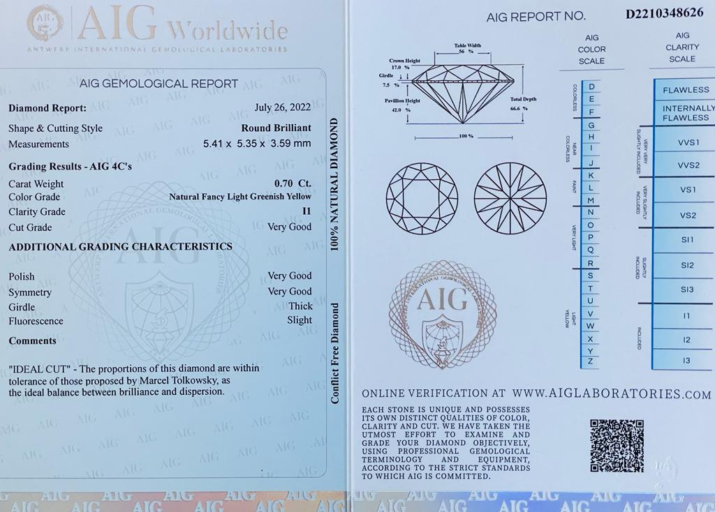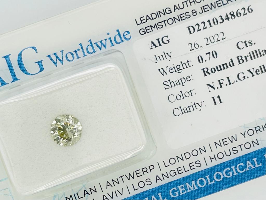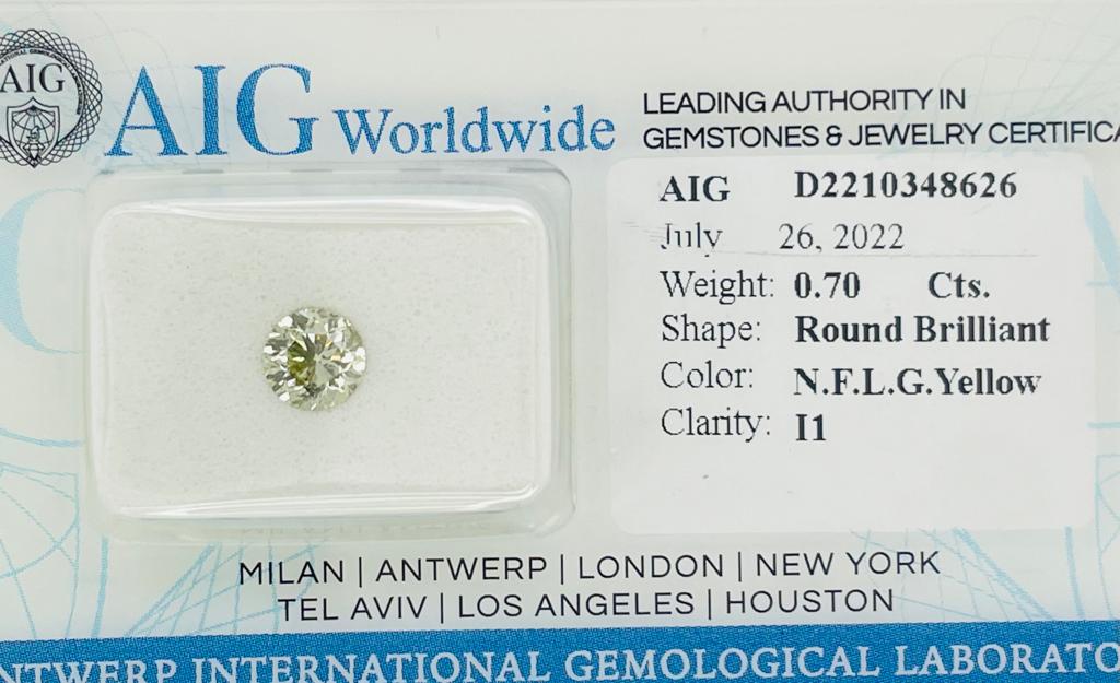 DIAMANTE NATURAL POLISHED 0,7 CARATI COLORE FANCY GIALLO CHIARO VERDASTRO - PUREZZA I1 - TAGLIO BRILLANTE - CERTIFICATO AIG - C20710-2