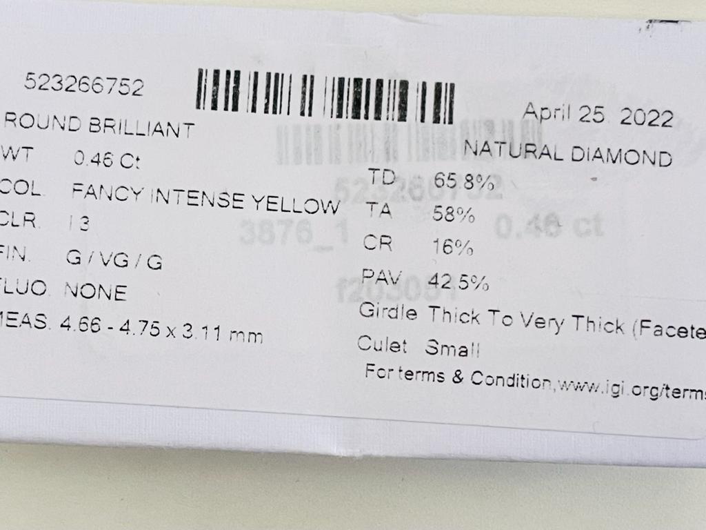 DIAMANTE NATURAL POLISHED 0,46 CARATI COLORE FANCY GIALLO INTENSO - PUREZZA I3 - TAGLIO BRILLANTE – CERTIFICATO IGI - F20305-1