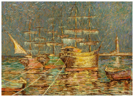 GINO TASSINARI Livorno 1920 – 2001 Barconi 1972 Olio su tela 50 x 70. Firma, località, data e titolo (poco leggibile) sul verso.