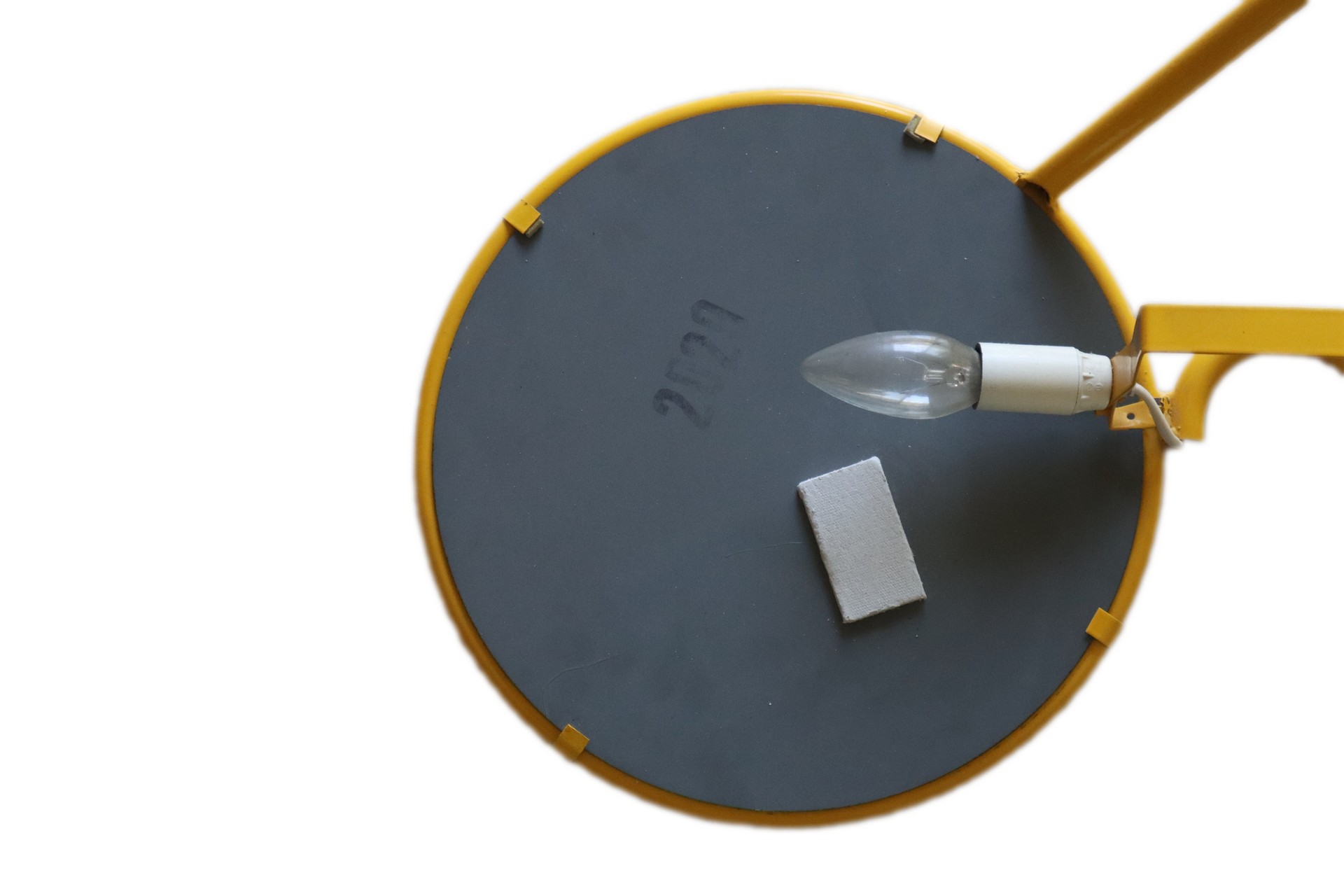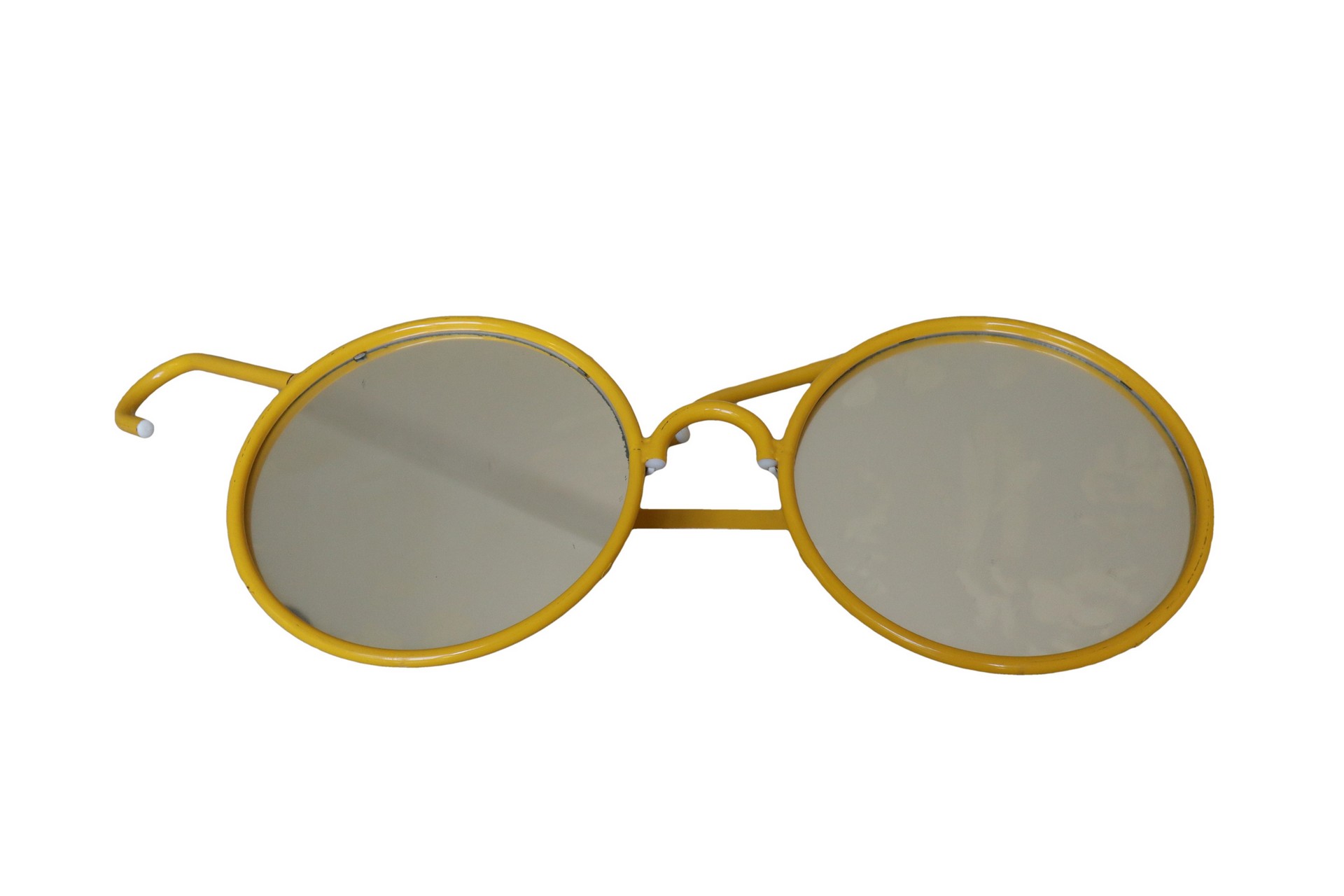 Lampada a parete a guisa di occhiale, produzione italiana nello stile di Lapo Binazzi, 80s Diametro cm 30,profondità cm 20, lunghezza cm 90 Struttura in tubolare metallico laccato nei toni del giallo, diffusori in specchio. Presenta segni di uso.
